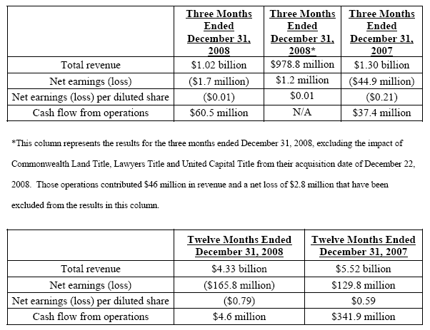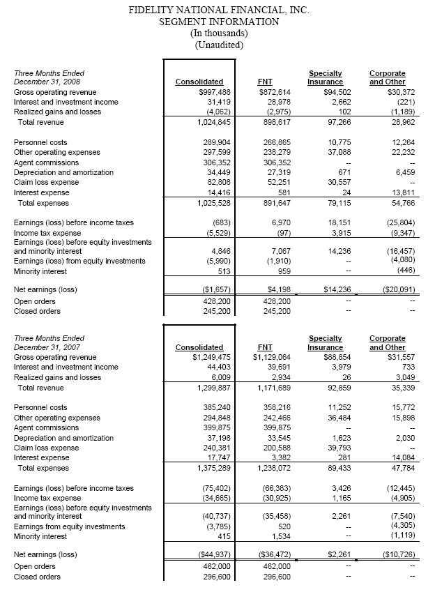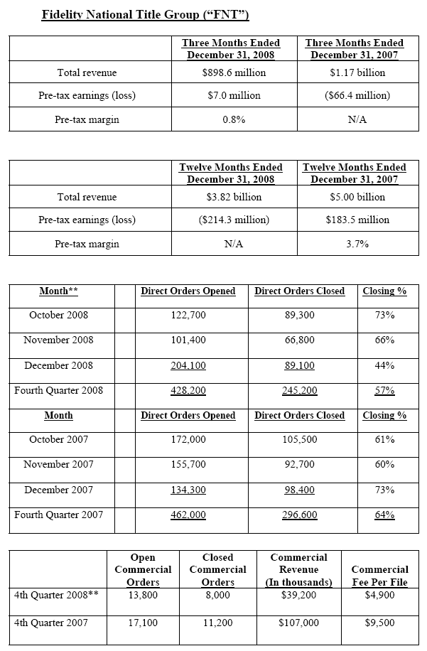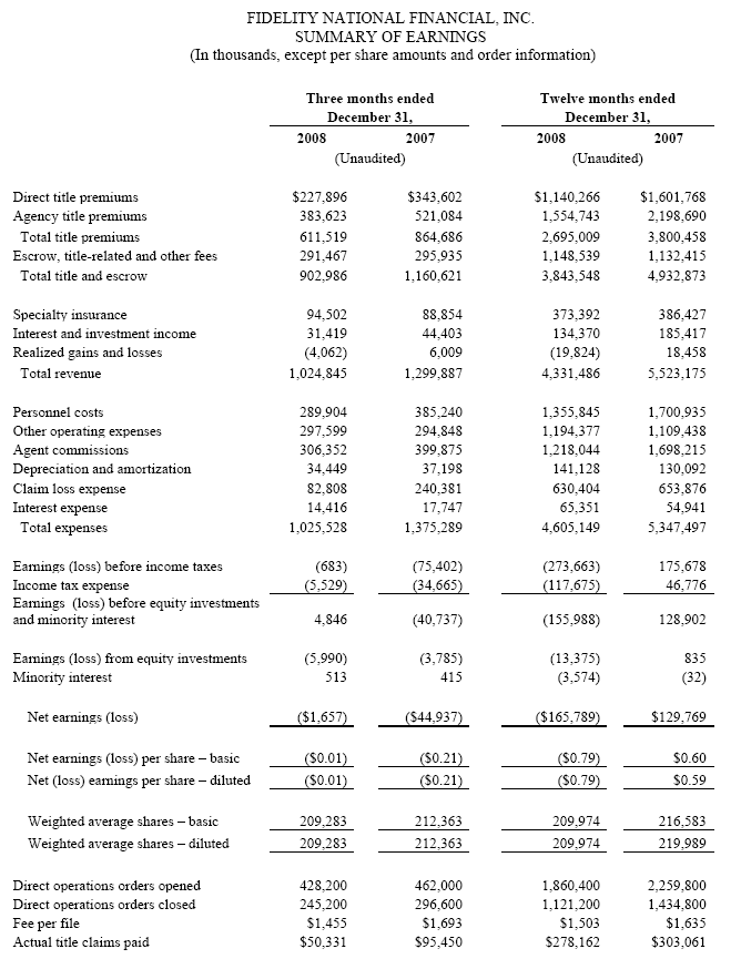 Jacksonville, Fla. -- (February 4, 2009) -- Fidelity National Financial, Inc. (NYSE:FNF), a leading provider of title insurance, specialty insurance, claims management services and information services, today reported operating results for the three-month and twelve-month periods ended December 31, 2008. These reported results include the impact of Commonwealth Land Title Insurance Company, Lawyers Title Insurance Corporation and United Capital Title Insurance Company from their acquisition date of December 22, 2008.