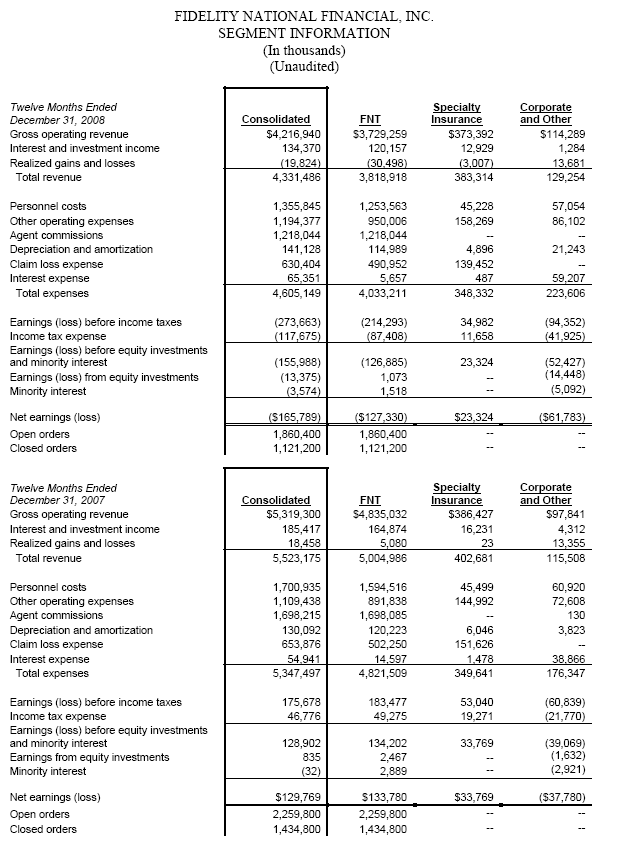 The following are summary financial and operational results for the operating segments of FNF for the three-month and twelve-month periods ended December 31, 2008 and 2007: