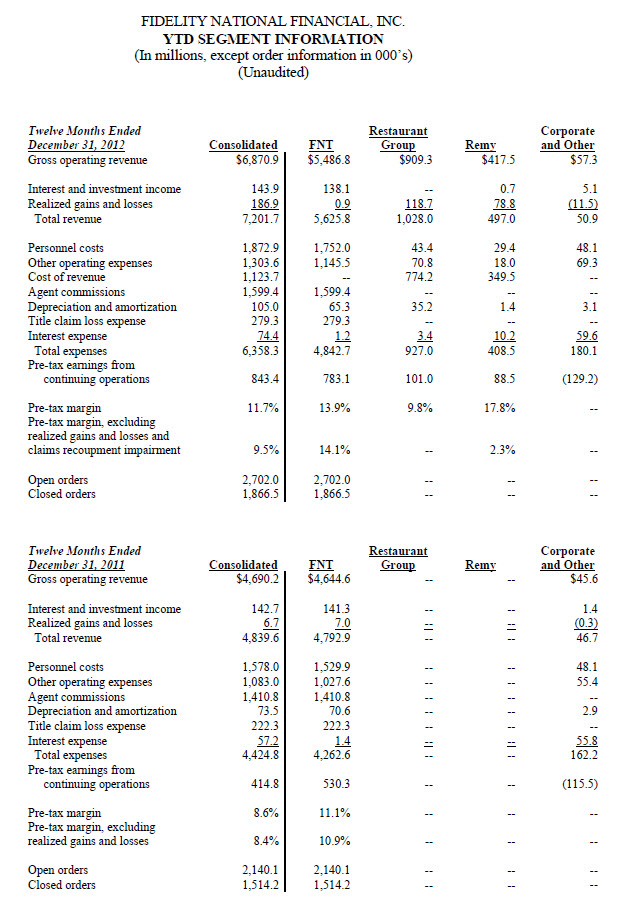 The following are summary financial and operational results for the operating segments of FNF for the three-month and twelve-month periods ended December 31, 2012 and 2011: