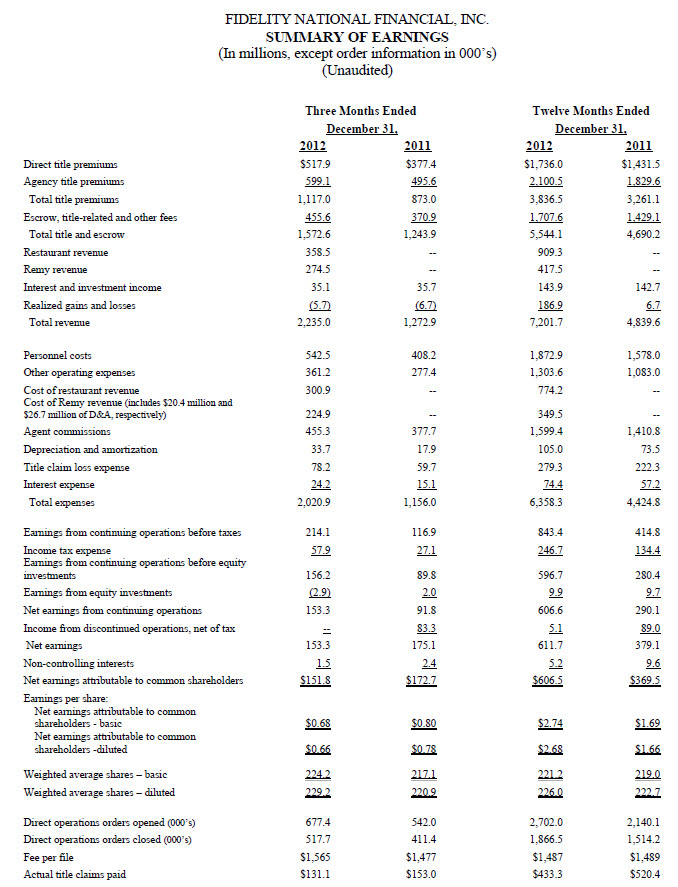 Jacksonville, Fla. -- (February 19, 2013) -- Fidelity National Financial, Inc. (NYSE:FNF), a leading provider of title insurance, mortgage services and diversified services, today reported operating results for the three-month and twelve-month periods ended December 31, 2012.