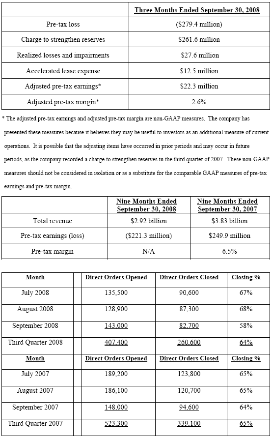 "We continue to operate our businesses in an extremely difficult economic environment," said Chairman William P. Foley, II. "Order counts in the title business continued to be weak in July and August, with a short-lived increase in early September that lasted only a few weeks. We remain focused on cost and expense management throughout the company, as we eliminated approximately 1,000 additional positions in the third quarter. The majority of those eliminations came later in the quarter, so our reported results do not reflect any significant benefit from those late quarter staffing reductions. Additionally, on October 1, we instituted a 10% company-wide pay reduction that will most likely remain in place through the first quarter of 2009. We also continued to close title and escrow offices during the third quarter, closing more than 115 offices at a total accelerated lease expense of $12.5 million. The significant weakness in the capital markets also required us to record $42 million in realized losses during the quarter, with $7 million in actual realized losses from securities sold and $35 million in impairments from corporate bonds and equity securities. We continue to manage our investment portfolio in a conservative fashion, as the average rating remains Aa1/AA+ and the duration remains approximately three years. The $35 million in impairments are other than temporary accounting impairments, not actual cash losses. The final material event during the quarter was the $261.6 million reserve strengthening charge. Based on continued adverse reported and paid claims trends over the last six quarters, we made the decision in the third quarter to more heavily weight the three most recent full year's data on loss experience in the actuarial model and incorporate that data into the assumptions and factors that determine ultimate expected loss experience for all prior calendar years. This particular change was the primary driver in requiring a significant increase in the level of our balance sheet reserve position. We believe this update to the actuarial model better reflects the expected loss experience that we will ultimately record because of this very difficult market.