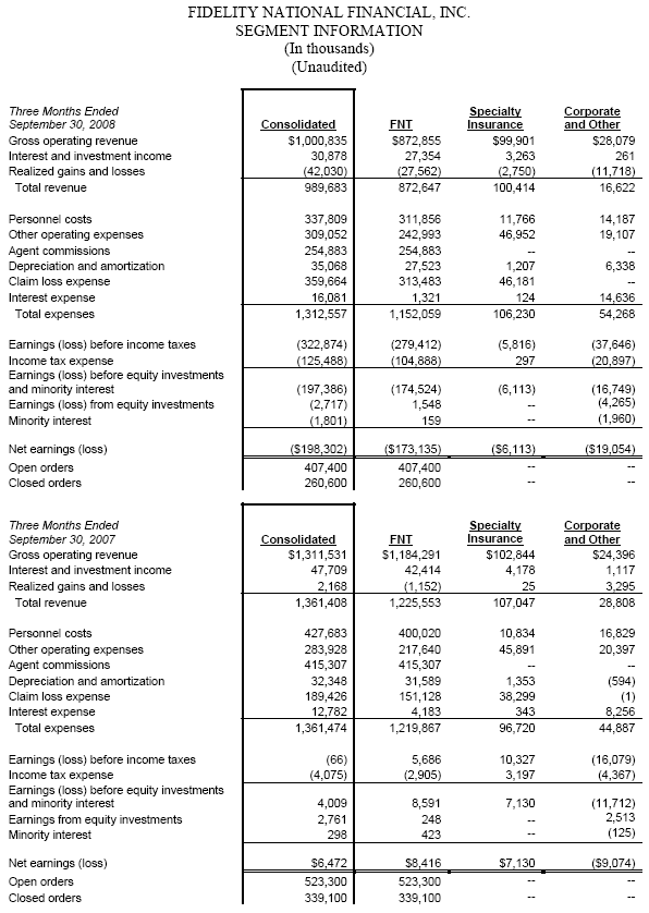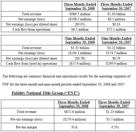 Jacksonville, Fla. -- (October 22, 2008) -- Fidelity National Financial, Inc. (NYSE:FNF), a leading provider of title insurance, specialty insurance, claims management services and information services, today reported operating results for the three-month and nine-month periods ended September 30, 2008.