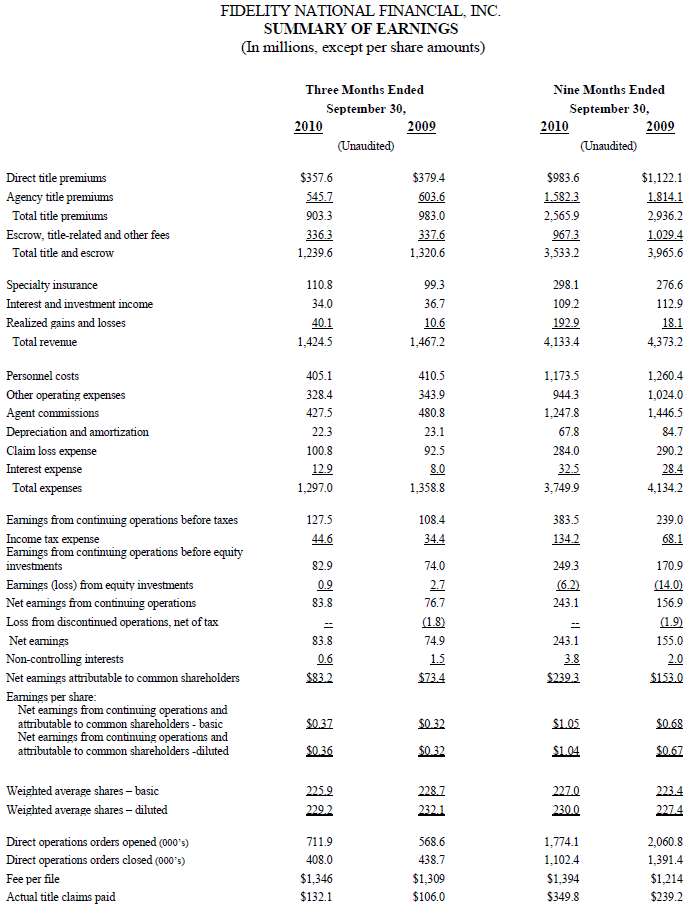 Jacksonville, Fla. -- (October 20, 2010) -- Fidelity National Financial, Inc. (NYSE:FNF), a leading provider of title insurance, mortgage services, specialty insurance and information services, today reported operating results for the three-month and nine-month periods ended September 30, 2010.