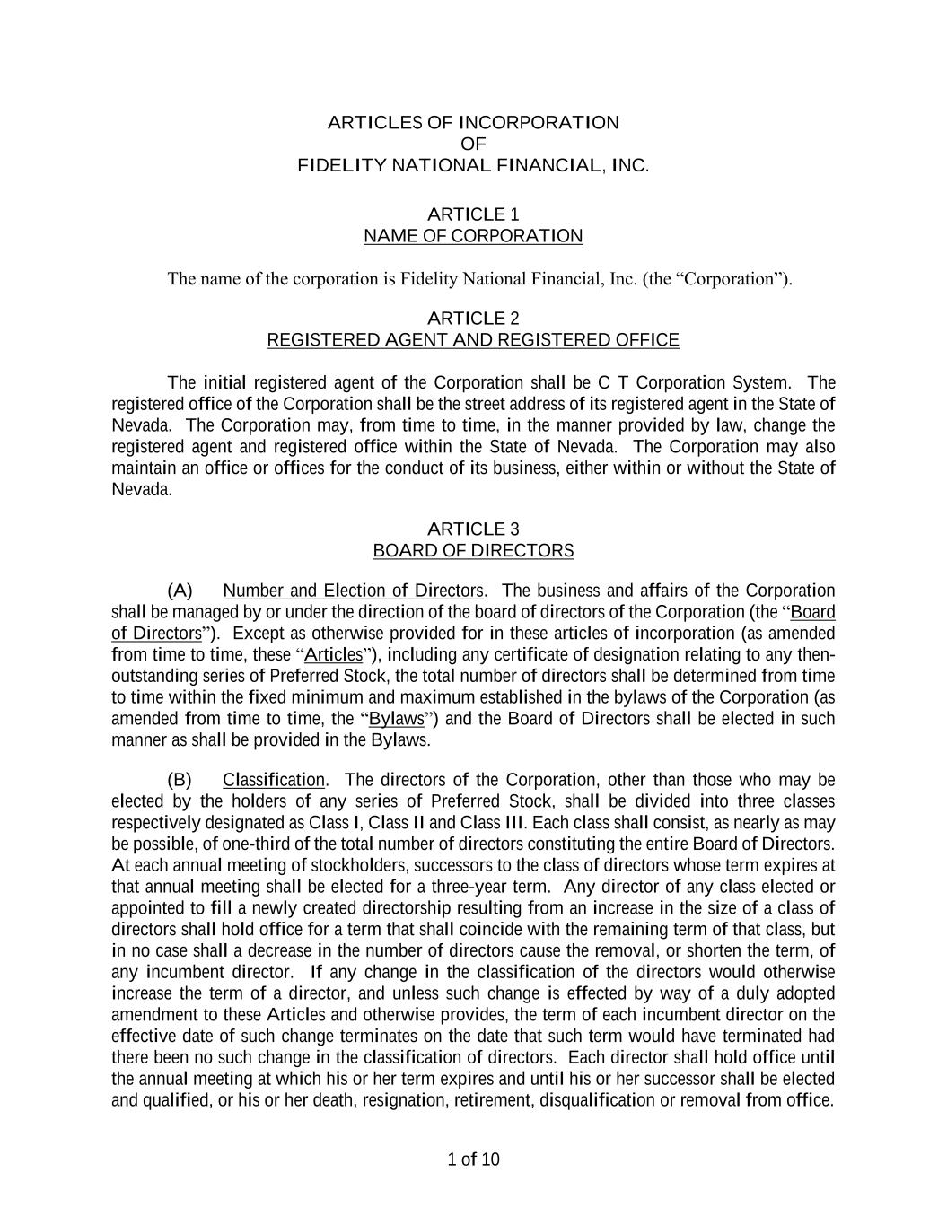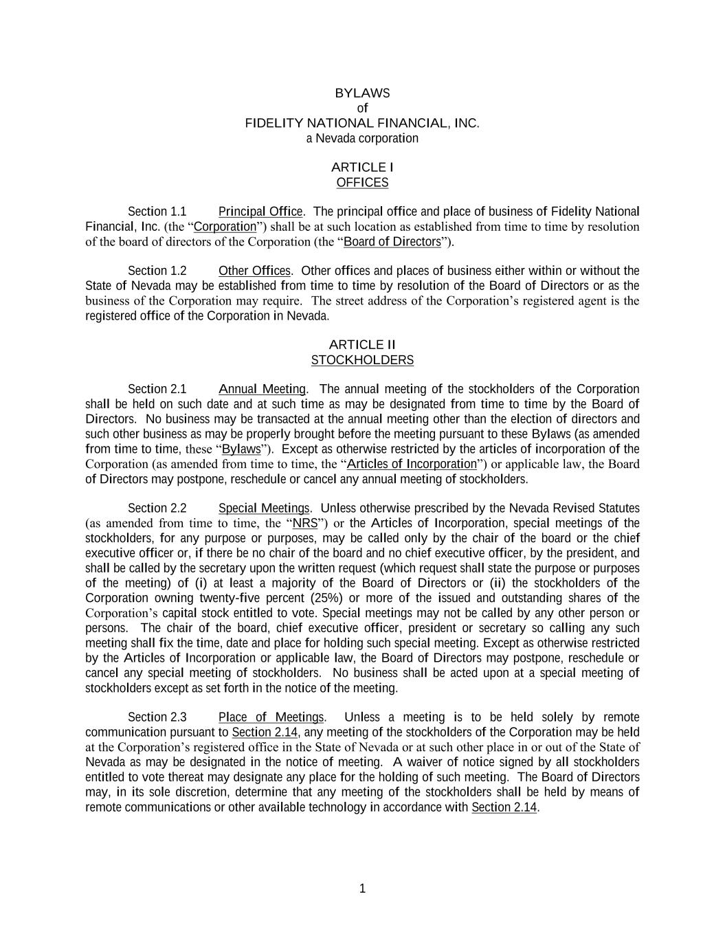 1 BYLAWS of FIDELITY NATIONAL FINANCIAL, INC. a Nevada corporation ARTICLE I OFFICES Section 1.1 Principal Office. The principal office and place of business of Fidelity National Financial, Inc. (the “Corporation”) shall be at such location as established from time to time by resolution of the board of directors of the Corporation (the “Board of Directors”). Section 1.2 Other Offices. Other offices and places of business either within or without the State of Nevada may be established from time to time by resolution of the Board of Directors or as the business of the Corporation may require. The street address of the Corporation’s registered agent is the registered office of the Corporation in Nevada. ARTICLE II STOCKHOLDERS Section 2.1 Annual Meeting. The annual meeting of the stockholders of the Corporation shall be held on such date and at such time as may be designated from time to time by the Board of Directors. No business may be transacted at the annual meeting other than the election of directors and such other business as may be properly brought before the meeting pursuant to these Bylaws (as amended from time to time, these “Bylaws”). Except as otherwise restricted by the articles of incorporation of the Corporation (as amended from time to time, the “Articles of Incorporation”) or applicable law, the Board of Directors may postpone, reschedule or cancel any annual meeting of stockholders. Section 2.2 Special Meetings. Unless otherwise prescribed by the Nevada Revised Statutes (as amended from time to time, the “NRS”) or the Articles of Incorporation, special meetings of the stockholders, for any purpose or purposes, may be called only by the chair of the board or the chief executive officer or, if there be no chair of the board and no chief executive officer, by the president, and shall be called by the secretary upon the written request (which request shall state the purpose or purposes of the meeting) of (i) at least a majority of the Board of Directors or (ii) the stockholders of the Corporation owning twenty-five percent (25%) or more of the issued and outstanding shares of the Corporation’s capital stock entitled to vote. Special meetings may not be called by any other person or persons. The chair of the board, chief executive officer, president or secretary so calling any such meeting shall fix the time, date and place for holding such special meeting. Except as otherwise restricted by the Articles of Incorporation or applicable law, the Board of Directors may postpone, reschedule or cancel any special meeting of stockholders. No business shall be acted upon at a special meeting of stockholders except as set forth in the notice of the meeting. Section 2.3 Place of Meetings. Unless a meeting is to be held solely by remote communication pursuant to Section 2.14, any meeting of the stockholders of the Corporation may be held at the Corporation’s registered office in the State of Nevada or at such other place in or out of the State of Nevada as may be designated in the notice of meeting. A waiver of notice signed by all stockholders entitled to vote thereat may designate any place for the holding of such meeting. The Board of Directors may, in its sole discretion, determine that any meeting of the stockholders shall be held by means of remote communications or other available technology in accordance with Section 2.14.