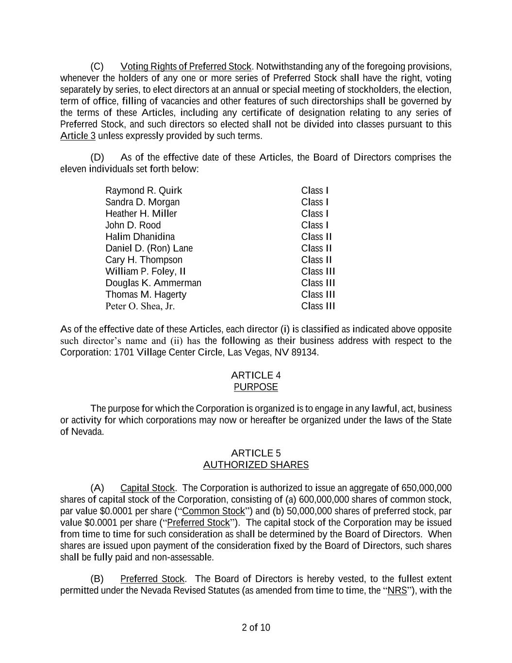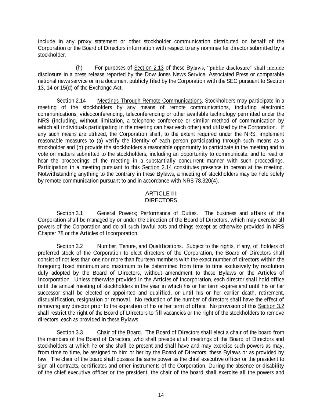 14 include in any proxy statement or other stockholder communication distributed on behalf of the Corporation or the Board of Directors information with respect to any nominee for director submitted by a stockholder. (h) For purposes of Section 2.13 of these Bylaws, “public disclosure” shall include disclosure in a press release reported by the Dow Jones News Service, Associated Press or comparable national news service or in a document publicly filed by the Corporation with the SEC pursuant to Section 13, 14 or 15(d) of the Exchange Act. Section 2.14 Meetings Through Remote Communications. Stockholders may participate in a meeting of the stockholders by any means of remote communications, including electronic communications, videoconferencing, teleconferencing or other available technology permitted under the NRS (including, without limitation, a telephone conference or similar method of communication by which all individuals participating in the meeting can hear each other) and utilized by the Corporation. If any such means are utilized, the Corporation shall, to the extent required under the NRS, implement reasonable measures to (a) verify the identity of each person participating through such means as a stockholder and (b) provide the stockholders a reasonable opportunity to participate in the meeting and to vote on matters submitted to the stockholders, including an opportunity to communicate, and to read or hear the proceedings of the meeting in a substantially concurrent manner with such proceedings. Participation in a meeting pursuant to this Section 2.14 constitutes presence in person at the meeting. Notwithstanding anything to the contrary in these Bylaws, a meeting of stockholders may be held solely by remote communication pursuant to and in accordance with NRS 78.320(4). ARTICLE III DIRECTORS Section 3.1 General Powers; Performance of Duties. The business and affairs of the Corporation shall be managed by or under the direction of the Board of Directors, which may exercise all powers of the Corporation and do all such lawful acts and things except as otherwise provided in NRS Chapter 78 or the Articles of Incorporation. Section 3.2 Number, Tenure, and Qualifications. Subject to the rights, if any, of holders of preferred stock of the Corporation to elect directors of the Corporation, the Board of Directors shall consist of not less than one nor more than fourteen members with the exact number of directors within the foregoing fixed minimum and maximum to be determined from time to time exclusively by resolution duly adopted by the Board of Directors, without amendment to these Bylaws or the Articles of Incorporation. Unless otherwise provided in the Articles of Incorporation, each director shall hold office until the annual meeting of stockholders in the year in which his or her term expires and until his or her successor shall be elected or appointed and qualified, or until his or her earlier death, retirement, disqualification, resignation or removal. No reduction of the number of directors shall have the effect of removing any director prior to the expiration of his or her term of office. No provision of this Section 3.2 shall restrict the right of the Board of Directors to fill vacancies or the right of the stockholders to remove directors, each as provided in these Bylaws. Section 3.3 Chair of the Board. The Board of Directors shall elect a chair of the board from the members of the Board of Directors, who shall preside at all meetings of the Board of Directors and stockholders at which he or she shall be present and shall have and may exercise such powers as may, from time to time, be assigned to him or her by the Board of Directors, these Bylaws or as provided by law. The chair of the board shall possess the same power as the chief executive officer or the president to sign all contracts, certificates and other instruments of the Corporation. During the absence or disability of the chief executive officer or the president, the chair of the board shall exercise all the powers and