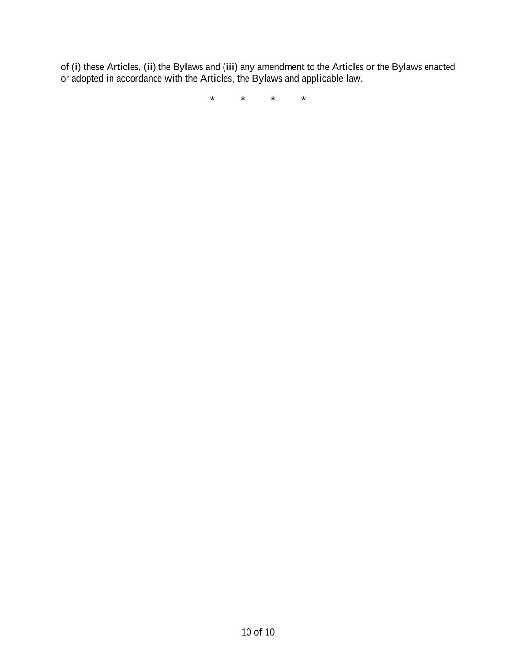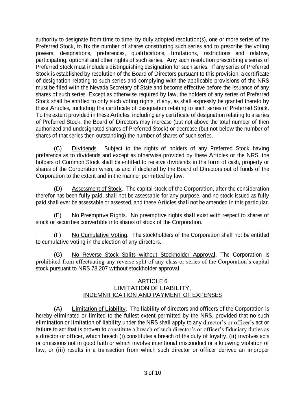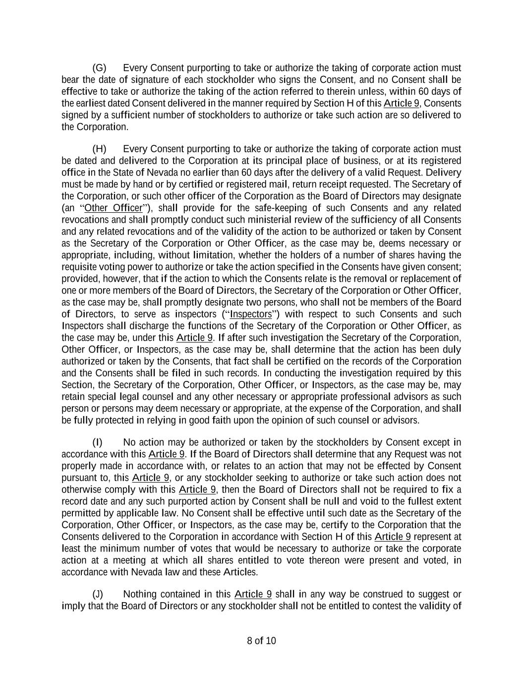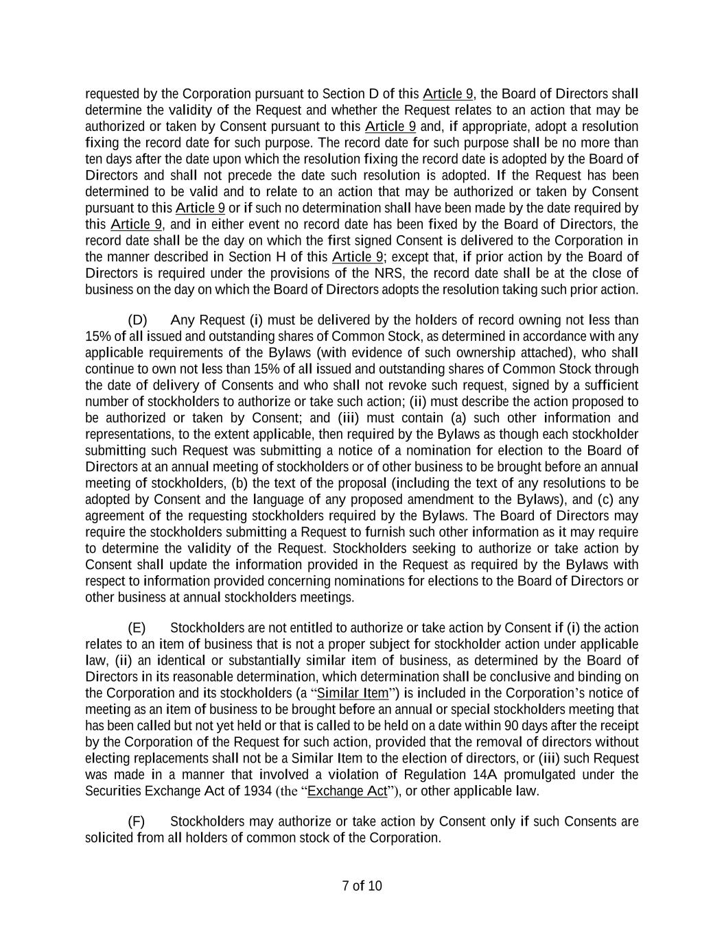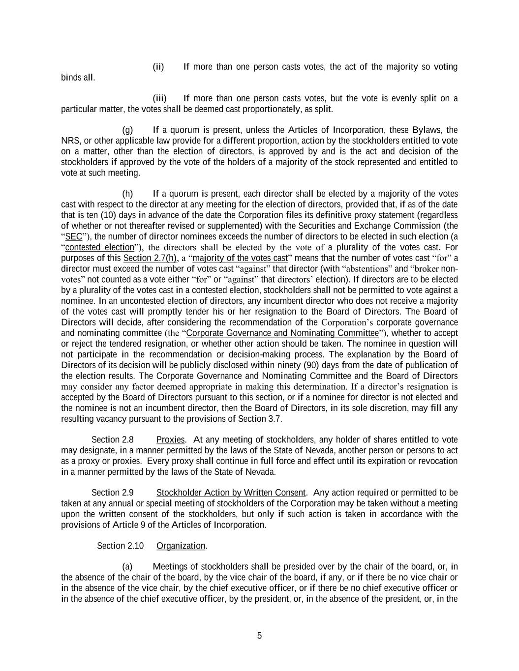 5 (ii) If more than one person casts votes, the act of the majority so voting binds all. (iii) If more than one person casts votes, but the vote is evenly split on a particular matter, the votes shall be deemed cast proportionately, as split. (g) If a quorum is present, unless the Articles of Incorporation, these Bylaws, the NRS, or other applicable law provide for a different proportion, action by the stockholders entitled to vote on a matter, other than the election of directors, is approved by and is the act and decision of the stockholders if approved by the vote of the holders of a majority of the stock represented and entitled to vote at such meeting. (h) If a quorum is present, each director shall be elected by a majority of the votes cast with respect to the director at any meeting for the election of directors, provided that, if as of the date that is ten (10) days in advance of the date the Corporation files its definitive proxy statement (regardless of whether or not thereafter revised or supplemented) with the Securities and Exchange Commission (the “SEC”), the number of director nominees exceeds the number of directors to be elected in such election (a “contested election”), the directors shall be elected by the vote of a plurality of the votes cast. For purposes of this Section 2.7(h), a “majority of the votes cast” means that the number of votes cast “for” a director must exceed the number of votes cast “against” that director (with “abstentions” and “broker non- votes” not counted as a vote either “for” or “against” that directors’ election). If directors are to be elected by a plurality of the votes cast in a contested election, stockholders shall not be permitted to vote against a nominee. In an uncontested election of directors, any incumbent director who does not receive a majority of the votes cast will promptly tender his or her resignation to the Board of Directors. The Board of Directors will decide, after considering the recommendation of the Corporation’s corporate governance and nominating committee (the “Corporate Governance and Nominating Committee”), whether to accept or reject the tendered resignation, or whether other action should be taken. The nominee in question will not participate in the recommendation or decision-making process. The explanation by the Board of Directors of its decision will be publicly disclosed within ninety (90) days from the date of publication of the election results. The Corporate Governance and Nominating Committee and the Board of Directors may consider any factor deemed appropriate in making this determination. If a director’s resignation is accepted by the Board of Directors pursuant to this section, or if a nominee for director is not elected and the nominee is not an incumbent director, then the Board of Directors, in its sole discretion, may fill any resulting vacancy pursuant to the provisions of Section 3.7. Section 2.8 Proxies. At any meeting of stockholders, any holder of shares entitled to vote may designate, in a manner permitted by the laws of the State of Nevada, another person or persons to act as a proxy or proxies. Every proxy shall continue in full force and effect until its expiration or revocation in a manner permitted by the laws of the State of Nevada. Section 2.9 Stockholder Action by Written Consent. Any action required or permitted to be taken at any annual or special meeting of stockholders of the Corporation may be taken without a meeting upon the written consent of the stockholders, but only if such action is taken in accordance with the provisions of Article 9 of the Articles of Incorporation. Section 2.10 Organization. (a) Meetings of stockholders shall be presided over by the chair of the board, or, in the absence of the chair of the board, by the vice chair of the board, if any, or if there be no vice chair or in the absence of the vice chair, by the chief executive officer, or if there be no chief executive officer or in the absence of the chief executive officer, by the president, or, in the absence of the president, or, in the