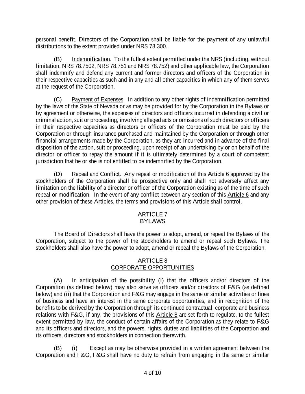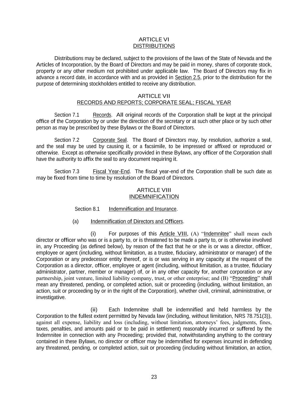 23 ARTICLE VI DISTRIBUTIONS Distributions may be declared, subject to the provisions of the laws of the State of Nevada and the Articles of Incorporation, by the Board of Directors and may be paid in money, shares of corporate stock, property or any other medium not prohibited under applicable law. The Board of Directors may fix in advance a record date, in accordance with and as provided in Section 2.5, prior to the distribution for the purpose of determining stockholders entitled to receive any distribution. ARTICLE VII RECORDS AND REPORTS; CORPORATE SEAL; FISCAL YEAR Section 7.1 Records. All original records of the Corporation shall be kept at the principal office of the Corporation by or under the direction of the secretary or at such other place or by such other person as may be prescribed by these Bylaws or the Board of Directors. Section 7.2 Corporate Seal. The Board of Directors may, by resolution, authorize a seal, and the seal may be used by causing it, or a facsimile, to be impressed or affixed or reproduced or otherwise. Except as otherwise specifically provided in these Bylaws, any officer of the Corporation shall have the authority to affix the seal to any document requiring it. Section 7.3 Fiscal Year-End. The fiscal year-end of the Corporation shall be such date as may be fixed from time to time by resolution of the Board of Directors. ARTICLE VIII INDEMNIFICATION Section 8.1 Indemnification and Insurance. (a) Indemnification of Directors and Officers. (i) For purposes of this Article VIII, (A) “Indemnitee” shall mean each director or officer who was or is a party to, or is threatened to be made a party to, or is otherwise involved in, any Proceeding (as defined below), by reason of the fact that he or she is or was a director, officer, employee or agent (including, without limitation, as a trustee, fiduciary, administrator or manager) of the Corporation or any predecessor entity thereof, or is or was serving in any capacity at the request of the Corporation as a director, officer, employee or agent (including, without limitation, as a trustee, fiduciary administrator, partner, member or manager) of, or in any other capacity for, another corporation or any partnership, joint venture, limited liability company, trust, or other enterprise; and (B) “Proceeding” shall mean any threatened, pending, or completed action, suit or proceeding (including, without limitation, an action, suit or proceeding by or in the right of the Corporation), whether civil, criminal, administrative, or investigative. (ii) Each Indemnitee shall be indemnified and held harmless by the Corporation to the fullest extent permitted by Nevada law (including, without limitation, NRS 78.751(3)), against all expense, liability and loss (including, without limitation, attorneys’ fees, judgments, fines, taxes, penalties, and amounts paid or to be paid in settlement) reasonably incurred or suffered by the Indemnitee in connection with any Proceeding; provided that, notwithstanding anything to the contrary contained in these Bylaws, no director or officer may be indemnified for expenses incurred in defending any threatened, pending, or completed action, suit or proceeding (including without limitation, an action,