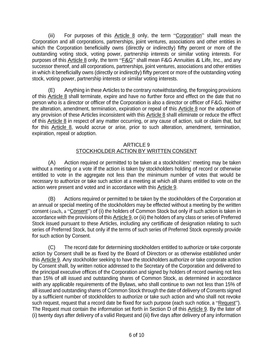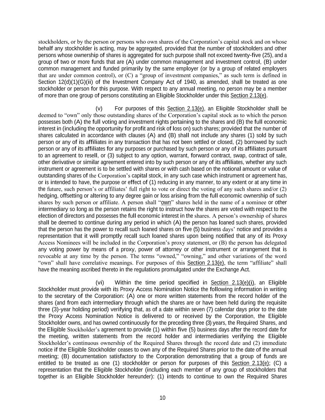 10 stockholders, or by the person or persons who own shares of the Corporation’s capital stock and on whose behalf any stockholder is acting, may be aggregated, provided that the number of stockholders and other persons whose ownership of shares is aggregated for such purpose shall not exceed twenty-five (25), and a group of two or more funds that are (A) under common management and investment control, (B) under common management and funded primarily by the same employer (or by a group of related employers that are under common control), or (C) a “group of investment companies,” as such term is defined in Section 12(d)(1)(G)(ii) of the Investment Company Act of 1940, as amended, shall be treated as one stockholder or person for this purpose. With respect to any annual meeting, no person may be a member of more than one group of persons constituting an Eligible Stockholder under this Section 2.13(e). (v) For purposes of this Section 2.13(e), an Eligible Stockholder shall be deemed to “own” only those outstanding shares of the Corporation’s capital stock as to which the person possesses both (A) the full voting and investment rights pertaining to the shares and (B) the full economic interest in (including the opportunity for profit and risk of loss on) such shares; provided that the number of shares calculated in accordance with clauses (A) and (B) shall not include any shares (1) sold by such person or any of its affiliates in any transaction that has not been settled or closed, (2) borrowed by such person or any of its affiliates for any purposes or purchased by such person or any of its affiliates pursuant to an agreement to resell, or (3) subject to any option, warrant, forward contract, swap, contract of sale, other derivative or similar agreement entered into by such person or any of its affiliates, whether any such instrument or agreement is to be settled with shares or with cash based on the notional amount or value of outstanding shares of the Corporation’s capital stock, in any such case which instrument or agreement has, or is intended to have, the purpose or effect of (1) reducing in any manner, to any extent or at any time in the future, such person’s or affiliates’ full right to vote or direct the voting of any such shares and/or (2) hedging, offsetting or altering to any degree gain or loss arising from the full economic ownership of such shares by such person or affiliate. A person shall “own” shares held in the name of a nominee or other intermediary so long as the person retains the right to instruct how the shares are voted with respect to the election of directors and possesses the full economic interest in the shares. A person’s ownership of shares shall be deemed to continue during any period in which (A) the person has loaned such shares, provided that the person has the power to recall such loaned shares on five (5) business days’ notice and provides a representation that it will promptly recall such loaned shares upon being notified that any of its Proxy Access Nominees will be included in the Corporation’s proxy statement, or (B) the person has delegated any voting power by means of a proxy, power of attorney or other instrument or arrangement that is revocable at any time by the person. The terms “owned,” “owning,” and other variations of the word “own” shall have correlative meanings. For purposes of this Section 2.13(e), the term “affiliate” shall have the meaning ascribed thereto in the regulations promulgated under the Exchange Act. (vi) Within the time period specified in Section 2.13(e)(i), an Eligible Stockholder must provide with its Proxy Access Nomination Notice the following information in writing to the secretary of the Corporation: (A) one or more written statements from the record holder of the shares (and from each intermediary through which the shares are or have been held during the requisite three (3)-year holding period) verifying that, as of a date within seven (7) calendar days prior to the date the Proxy Access Nomination Notice is delivered to or received by the Corporation, the Eligible Stockholder owns, and has owned continuously for the preceding three (3) years, the Required Shares, and the Eligible Stockholder’s agreement to provide (1) within five (5) business days after the record date for the meeting, written statements from the record holder and intermediaries verifying the Eligible Stockholder’s continuous ownership of the Required Shares through the record date and (2) immediate notice if the Eligible Stockholder ceases to own any of the Required Shares prior to the date of the annual meeting; (B) documentation satisfactory to the Corporation demonstrating that a group of funds are entitled to be treated as one (1) stockholder or person for purposes of this Section 2.13(e); (C) a representation that the Eligible Stockholder (including each member of any group of stockholders that together is an Eligible Stockholder hereunder): (1) intends to continue to own the Required Shares