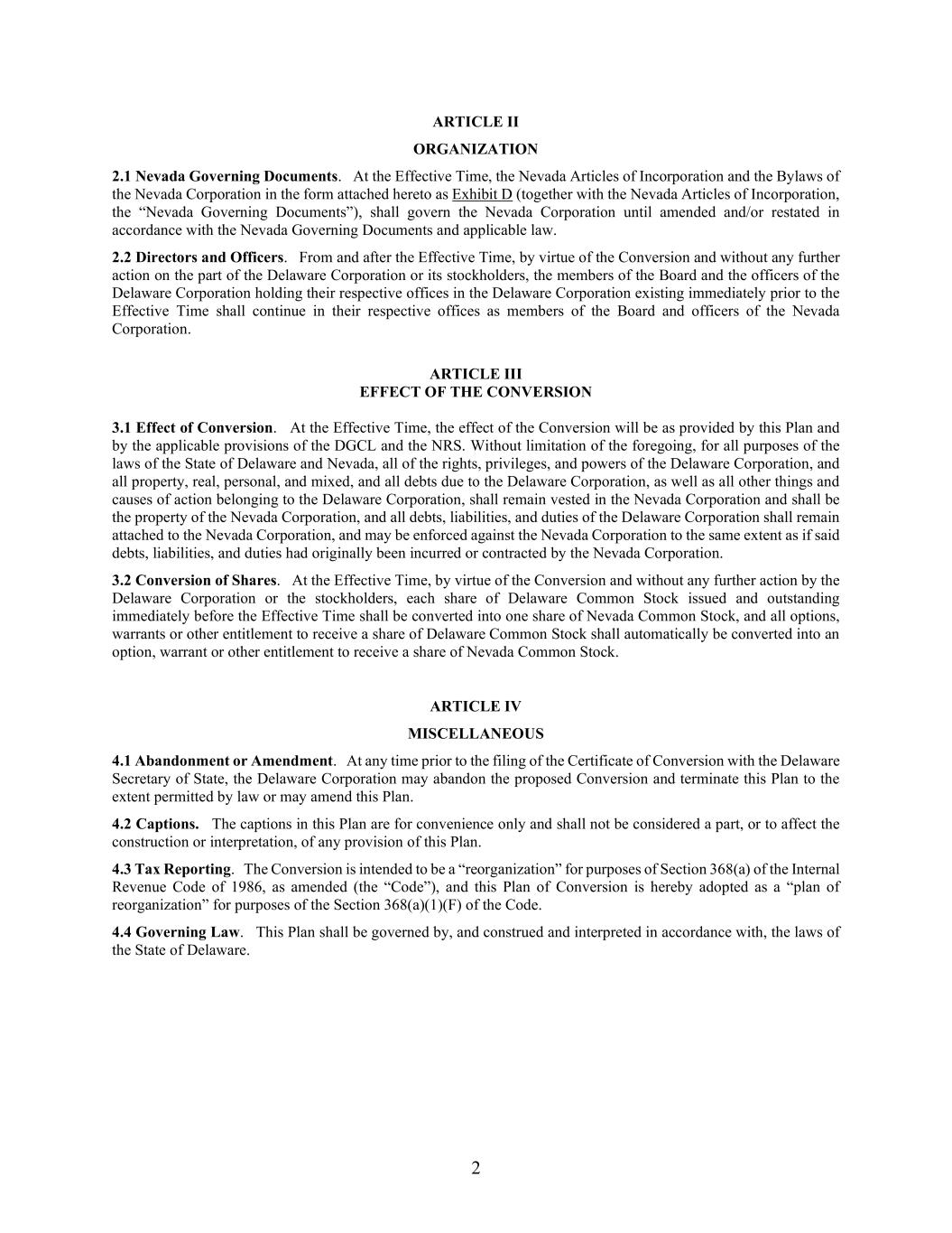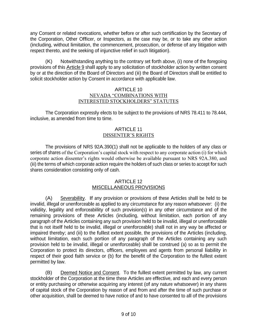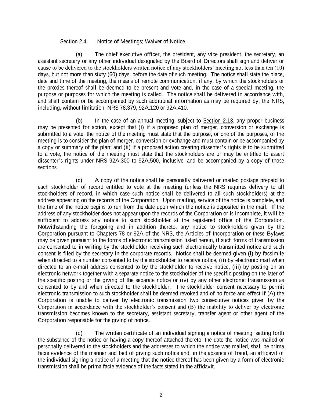 2 Section 2.4 Notice of Meetings; Waiver of Notice. (a) The chief executive officer, the president, any vice president, the secretary, an assistant secretary or any other individual designated by the Board of Directors shall sign and deliver or cause to be delivered to the stockholders written notice of any stockholders’ meeting not less than ten (10) days, but not more than sixty (60) days, before the date of such meeting. The notice shall state the place, date and time of the meeting, the means of remote communication, if any, by which the stockholders or the proxies thereof shall be deemed to be present and vote and, in the case of a special meeting, the purpose or purposes for which the meeting is called. The notice shall be delivered in accordance with, and shall contain or be accompanied by such additional information as may be required by, the NRS, including, without limitation, NRS 78.379, 92A.120 or 92A.410. (b) In the case of an annual meeting, subject to Section 2.13, any proper business may be presented for action, except that (i) if a proposed plan of merger, conversion or exchange is submitted to a vote, the notice of the meeting must state that the purpose, or one of the purposes, of the meeting is to consider the plan of merger, conversion or exchange and must contain or be accompanied by a copy or summary of the plan; and (ii) if a proposed action creating dissenter’s rights is to be submitted to a vote, the notice of the meeting must state that the stockholders are or may be entitled to assert dissenter’s rights under NRS 92A.300 to 92A.500, inclusive, and be accompanied by a copy of those sections. (c) A copy of the notice shall be personally delivered or mailed postage prepaid to each stockholder of record entitled to vote at the meeting (unless the NRS requires delivery to all stockholders of record, in which case such notice shall be delivered to all such stockholders) at the address appearing on the records of the Corporation. Upon mailing, service of the notice is complete, and the time of the notice begins to run from the date upon which the notice is deposited in the mail. If the address of any stockholder does not appear upon the records of the Corporation or is incomplete, it will be sufficient to address any notice to such stockholder at the registered office of the Corporation. Notwithstanding the foregoing and in addition thereto, any notice to stockholders given by the Corporation pursuant to Chapters 78 or 92A of the NRS, the Articles of Incorporation or these Bylaws may be given pursuant to the forms of electronic transmission listed herein, if such forms of transmission are consented to in writing by the stockholder receiving such electronically transmitted notice and such consent is filed by the secretary in the corporate records. Notice shall be deemed given (i) by facsimile when directed to a number consented to by the stockholder to receive notice, (ii) by electronic mail when directed to an e-mail address consented to by the stockholder to receive notice, (iii) by posting on an electronic network together with a separate notice to the stockholder of the specific posting on the later of the specific posting or the giving of the separate notice or (iv) by any other electronic transmission as consented to by and when directed to the stockholder. The stockholder consent necessary to permit electronic transmission to such stockholder shall be deemed revoked and of no force and effect if (A) the Corporation is unable to deliver by electronic transmission two consecutive notices given by the Corporation in accordance with the stockholder’s consent and (B) the inability to deliver by electronic transmission becomes known to the secretary, assistant secretary, transfer agent or other agent of the Corporation responsible for the giving of notice. (d) The written certificate of an individual signing a notice of meeting, setting forth the substance of the notice or having a copy thereof attached thereto, the date the notice was mailed or personally delivered to the stockholders and the addresses to which the notice was mailed, shall be prima facie evidence of the manner and fact of giving such notice and, in the absence of fraud, an affidavit of the individual signing a notice of a meeting that the notice thereof has been given by a form of electronic transmission shall be prima facie evidence of the facts stated in the affidavit.