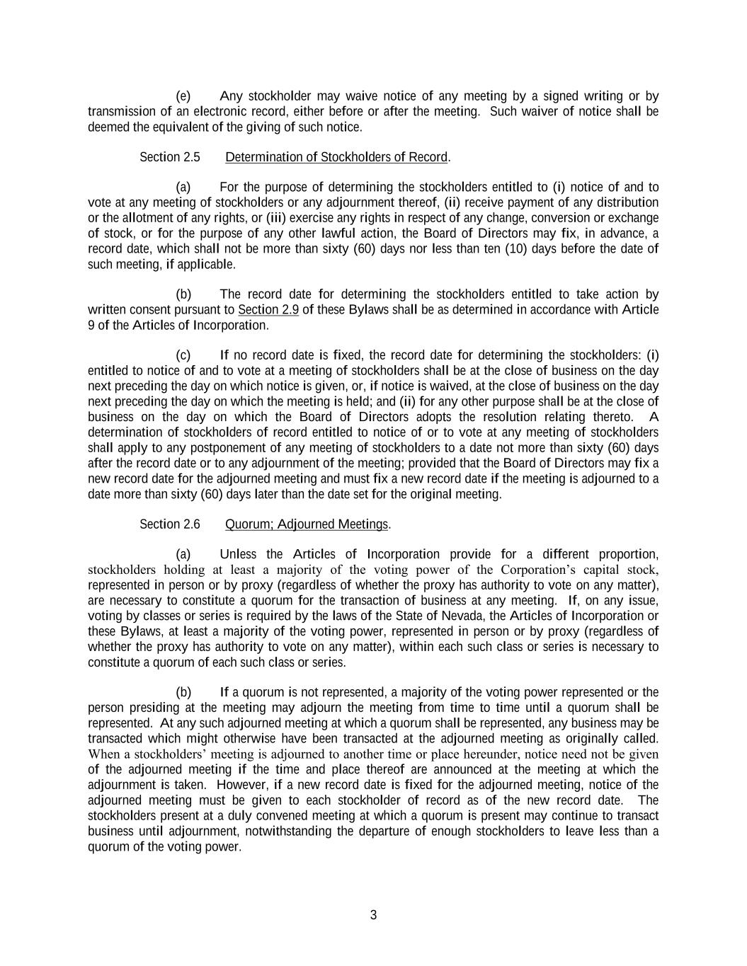 3 (e) Any stockholder may waive notice of any meeting by a signed writing or by transmission of an electronic record, either before or after the meeting. Such waiver of notice shall be deemed the equivalent of the giving of such notice. Section 2.5 Determination of Stockholders of Record. (a) For the purpose of determining the stockholders entitled to (i) notice of and to vote at any meeting of stockholders or any adjournment thereof, (ii) receive payment of any distribution or the allotment of any rights, or (iii) exercise any rights in respect of any change, conversion or exchange of stock, or for the purpose of any other lawful action, the Board of Directors may fix, in advance, a record date, which shall not be more than sixty (60) days nor less than ten (10) days before the date of such meeting, if applicable. (b) The record date for determining the stockholders entitled to take action by written consent pursuant to Section 2.9 of these Bylaws shall be as determined in accordance with Article 9 of the Articles of Incorporation. (c) If no record date is fixed, the record date for determining the stockholders: (i) entitled to notice of and to vote at a meeting of stockholders shall be at the close of business on the day next preceding the day on which notice is given, or, if notice is waived, at the close of business on the day next preceding the day on which the meeting is held; and (ii) for any other purpose shall be at the close of business on the day on which the Board of Directors adopts the resolution relating thereto. A determination of stockholders of record entitled to notice of or to vote at any meeting of stockholders shall apply to any postponement of any meeting of stockholders to a date not more than sixty (60) days after the record date or to any adjournment of the meeting; provided that the Board of Directors may fix a new record date for the adjourned meeting and must fix a new record date if the meeting is adjourned to a date more than sixty (60) days later than the date set for the original meeting. Section 2.6 Quorum; Adjourned Meetings. (a) Unless the Articles of Incorporation provide for a different proportion, stockholders holding at least a majority of the voting power of the Corporation’s capital stock, represented in person or by proxy (regardless of whether the proxy has authority to vote on any matter), are necessary to constitute a quorum for the transaction of business at any meeting. If, on any issue, voting by classes or series is required by the laws of the State of Nevada, the Articles of Incorporation or these Bylaws, at least a majority of the voting power, represented in person or by proxy (regardless of whether the proxy has authority to vote on any matter), within each such class or series is necessary to constitute a quorum of each such class or series. (b) If a quorum is not represented, a majority of the voting power represented or the person presiding at the meeting may adjourn the meeting from time to time until a quorum shall be represented. At any such adjourned meeting at which a quorum shall be represented, any business may be transacted which might otherwise have been transacted at the adjourned meeting as originally called. When a stockholders’ meeting is adjourned to another time or place hereunder, notice need not be given of the adjourned meeting if the time and place thereof are announced at the meeting at which the adjournment is taken. However, if a new record date is fixed for the adjourned meeting, notice of the adjourned meeting must be given to each stockholder of record as of the new record date. The stockholders present at a duly convened meeting at which a quorum is present may continue to transact business until adjournment, notwithstanding the departure of enough stockholders to leave less than a quorum of the voting power.