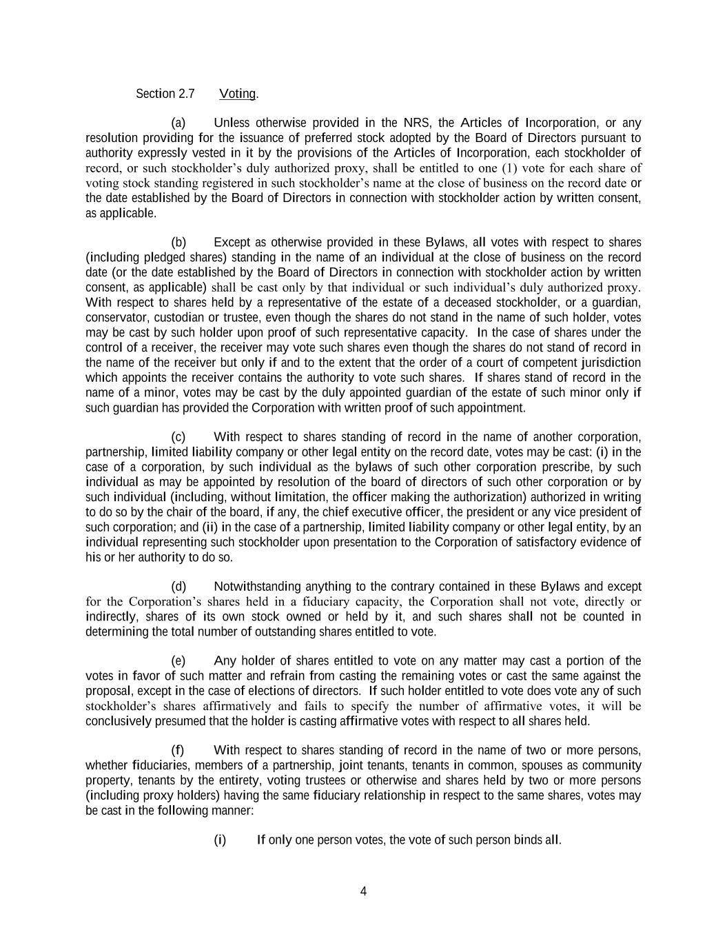 4 Section 2.7 Voting. (a) Unless otherwise provided in the NRS, the Articles of Incorporation, or any resolution providing for the issuance of preferred stock adopted by the Board of Directors pursuant to authority expressly vested in it by the provisions of the Articles of Incorporation, each stockholder of record, or such stockholder’s duly authorized proxy, shall be entitled to one (1) vote for each share of voting stock standing registered in such stockholder’s name at the close of business on the record date or the date established by the Board of Directors in connection with stockholder action by written consent, as applicable. (b) Except as otherwise provided in these Bylaws, all votes with respect to shares (including pledged shares) standing in the name of an individual at the close of business on the record date (or the date established by the Board of Directors in connection with stockholder action by written consent, as applicable) shall be cast only by that individual or such individual’s duly authorized proxy. With respect to shares held by a representative of the estate of a deceased stockholder, or a guardian, conservator, custodian or trustee, even though the shares do not stand in the name of such holder, votes may be cast by such holder upon proof of such representative capacity. In the case of shares under the control of a receiver, the receiver may vote such shares even though the shares do not stand of record in the name of the receiver but only if and to the extent that the order of a court of competent jurisdiction which appoints the receiver contains the authority to vote such shares. If shares stand of record in the name of a minor, votes may be cast by the duly appointed guardian of the estate of such minor only if such guardian has provided the Corporation with written proof of such appointment. (c) With respect to shares standing of record in the name of another corporation, partnership, limited liability company or other legal entity on the record date, votes may be cast: (i) in the case of a corporation, by such individual as the bylaws of such other corporation prescribe, by such individual as may be appointed by resolution of the board of directors of such other corporation or by such individual (including, without limitation, the officer making the authorization) authorized in writing to do so by the chair of the board, if any, the chief executive officer, the president or any vice president of such corporation; and (ii) in the case of a partnership, limited liability company or other legal entity, by an individual representing such stockholder upon presentation to the Corporation of satisfactory evidence of his or her authority to do so. (d) Notwithstanding anything to the contrary contained in these Bylaws and except for the Corporation’s shares held in a fiduciary capacity, the Corporation shall not vote, directly or indirectly, shares of its own stock owned or held by it, and such shares shall not be counted in determining the total number of outstanding shares entitled to vote. (e) Any holder of shares entitled to vote on any matter may cast a portion of the votes in favor of such matter and refrain from casting the remaining votes or cast the same against the proposal, except in the case of elections of directors. If such holder entitled to vote does vote any of such stockholder’s shares affirmatively and fails to specify the number of affirmative votes, it will be conclusively presumed that the holder is casting affirmative votes with respect to all shares held. (f) With respect to shares standing of record in the name of two or more persons, whether fiduciaries, members of a partnership, joint tenants, tenants in common, spouses as community property, tenants by the entirety, voting trustees or otherwise and shares held by two or more persons (including proxy holders) having the same fiduciary relationship in respect to the same shares, votes may be cast in the following manner: (i) If only one person votes, the vote of such person binds all.