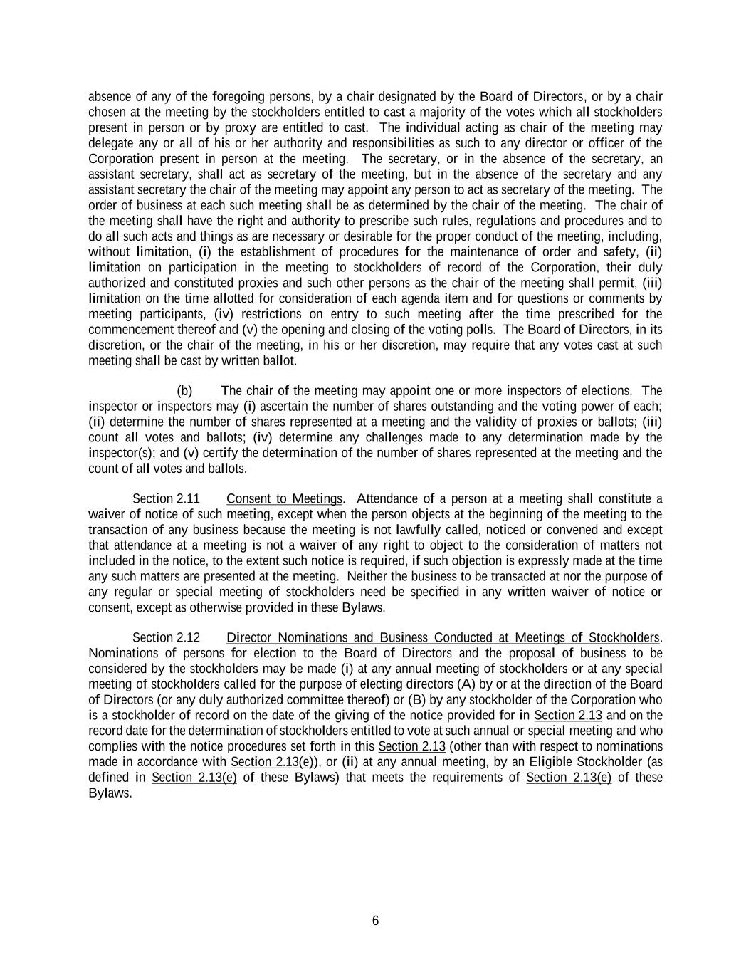 6 absence of any of the foregoing persons, by a chair designated by the Board of Directors, or by a chair chosen at the meeting by the stockholders entitled to cast a majority of the votes which all stockholders present in person or by proxy are entitled to cast. The individual acting as chair of the meeting may delegate any or all of his or her authority and responsibilities as such to any director or officer of the Corporation present in person at the meeting. The secretary, or in the absence of the secretary, an assistant secretary, shall act as secretary of the meeting, but in the absence of the secretary and any assistant secretary the chair of the meeting may appoint any person to act as secretary of the meeting. The order of business at each such meeting shall be as determined by the chair of the meeting. The chair of the meeting shall have the right and authority to prescribe such rules, regulations and procedures and to do all such acts and things as are necessary or desirable for the proper conduct of the meeting, including, without limitation, (i) the establishment of procedures for the maintenance of order and safety, (ii) limitation on participation in the meeting to stockholders of record of the Corporation, their duly authorized and constituted proxies and such other persons as the chair of the meeting shall permit, (iii) limitation on the time allotted for consideration of each agenda item and for questions or comments by meeting participants, (iv) restrictions on entry to such meeting after the time prescribed for the commencement thereof and (v) the opening and closing of the voting polls. The Board of Directors, in its discretion, or the chair of the meeting, in his or her discretion, may require that any votes cast at such meeting shall be cast by written ballot. (b) The chair of the meeting may appoint one or more inspectors of elections. The inspector or inspectors may (i) ascertain the number of shares outstanding and the voting power of each; (ii) determine the number of shares represented at a meeting and the validity of proxies or ballots; (iii) count all votes and ballots; (iv) determine any challenges made to any determination made by the inspector(s); and (v) certify the determination of the number of shares represented at the meeting and the count of all votes and ballots. Section 2.11 Consent to Meetings. Attendance of a person at a meeting shall constitute a waiver of notice of such meeting, except when the person objects at the beginning of the meeting to the transaction of any business because the meeting is not lawfully called, noticed or convened and except that attendance at a meeting is not a waiver of any right to object to the consideration of matters not included in the notice, to the extent such notice is required, if such objection is expressly made at the time any such matters are presented at the meeting. Neither the business to be transacted at nor the purpose of any regular or special meeting of stockholders need be specified in any written waiver of notice or consent, except as otherwise provided in these Bylaws. Section 2.12 Director Nominations and Business Conducted at Meetings of Stockholders. Nominations of persons for election to the Board of Directors and the proposal of business to be considered by the stockholders may be made (i) at any annual meeting of stockholders or at any special meeting of stockholders called for the purpose of electing directors (A) by or at the direction of the Board of Directors (or any duly authorized committee thereof) or (B) by any stockholder of the Corporation who is a stockholder of record on the date of the giving of the notice provided for in Section 2.13 and on the record date for the determination of stockholders entitled to vote at such annual or special meeting and who complies with the notice procedures set forth in this Section 2.13 (other than with respect to nominations made in accordance with Section 2.13(e)), or (ii) at any annual meeting, by an Eligible Stockholder (as defined in Section 2.13(e) of these Bylaws) that meets the requirements of Section 2.13(e) of these Bylaws.