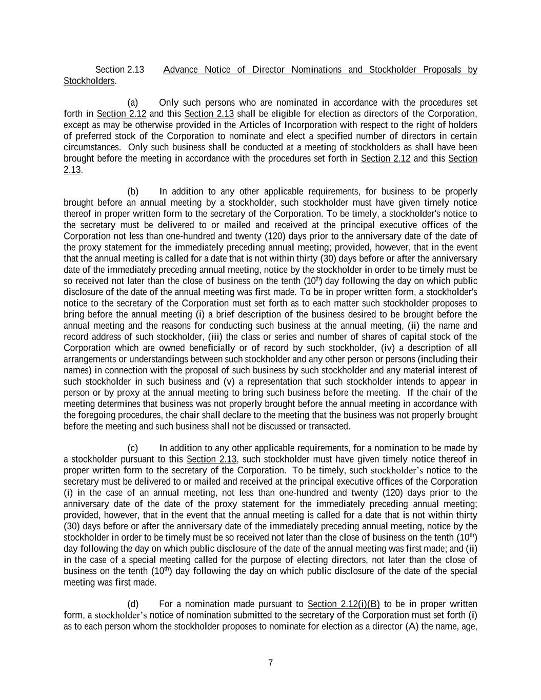 7 Section 2.13 Advance Notice of Director Nominations and Stockholder Proposals by Stockholders. (a) Only such persons who are nominated in accordance with the procedures set forth in Section 2.12 and this Section 2.13 shall be eligible for election as directors of the Corporation, except as may be otherwise provided in the Articles of Incorporation with respect to the right of holders of preferred stock of the Corporation to nominate and elect a specified number of directors in certain circumstances. Only such business shall be conducted at a meeting of stockholders as shall have been brought before the meeting in accordance with the procedures set forth in Section 2.12 and this Section 2.13. (b) In addition to any other applicable requirements, for business to be properly brought before an annual meeting by a stockholder, such stockholder must have given timely notice thereof in proper written form to the secretary of the Corporation. To be timely, a stockholder's notice to the secretary must be delivered to or mailed and received at the principal executive offices of the Corporation not less than one-hundred and twenty (120) days prior to the anniversary date of the date of the proxy statement for the immediately preceding annual meeting; provided, however, that in the event that the annual meeting is called for a date that is not within thirty (30) days before or after the anniversary date of the immediately preceding annual meeting, notice by the stockholder in order to be timely must be so received not later than the close of business on the tenth (10th) day following the day on which public disclosure of the date of the annual meeting was first made. To be in proper written form, a stockholder's notice to the secretary of the Corporation must set forth as to each matter such stockholder proposes to bring before the annual meeting (i) a brief description of the business desired to be brought before the annual meeting and the reasons for conducting such business at the annual meeting, (ii) the name and record address of such stockholder, (iii) the class or series and number of shares of capital stock of the Corporation which are owned beneficially or of record by such stockholder, (iv) a description of all arrangements or understandings between such stockholder and any other person or persons (including their names) in connection with the proposal of such business by such stockholder and any material interest of such stockholder in such business and (v) a representation that such stockholder intends to appear in person or by proxy at the annual meeting to bring such business before the meeting. If the chair of the meeting determines that business was not properly brought before the annual meeting in accordance with the foregoing procedures, the chair shall declare to the meeting that the business was not properly brought before the meeting and such business shall not be discussed or transacted. (c) In addition to any other applicable requirements, for a nomination to be made by a stockholder pursuant to this Section 2.13, such stockholder must have given timely notice thereof in proper written form to the secretary of the Corporation. To be timely, such stockholder’s notice to the secretary must be delivered to or mailed and received at the principal executive offices of the Corporation (i) in the case of an annual meeting, not less than one-hundred and twenty (120) days prior to the anniversary date of the date of the proxy statement for the immediately preceding annual meeting; provided, however, that in the event that the annual meeting is called for a date that is not within thirty (30) days before or after the anniversary date of the immediately preceding annual meeting, notice by the stockholder in order to be timely must be so received not later than the close of business on the tenth (10th) day following the day on which public disclosure of the date of the annual meeting was first made; and (ii) in the case of a special meeting called for the purpose of electing directors, not later than the close of business on the tenth (10th) day following the day on which public disclosure of the date of the special meeting was first made. (d) For a nomination made pursuant to Section 2.12(i)(B) to be in proper written form, a stockholder’s notice of nomination submitted to the secretary of the Corporation must set forth (i) as to each person whom the stockholder proposes to nominate for election as a director (A) the name, age,