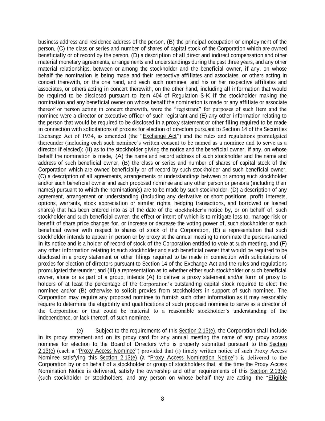 8 business address and residence address of the person, (B) the principal occupation or employment of the person, (C) the class or series and number of shares of capital stock of the Corporation which are owned beneficially or of record by the person, (D) a description of all direct and indirect compensation and other material monetary agreements, arrangements and understandings during the past three years, and any other material relationships, between or among the stockholder and the beneficial owner, if any, on whose behalf the nomination is being made and their respective affiliates and associates, or others acting in concert therewith, on the one hand, and each such nominee, and his or her respective affiliates and associates, or others acting in concert therewith, on the other hand, including all information that would be required to be disclosed pursuant to Item 404 of Regulation S-K if the stockholder making the nomination and any beneficial owner on whose behalf the nomination is made or any affiliate or associate thereof or person acting in concert therewith, were the “registrant” for purposes of such Item and the nominee were a director or executive officer of such registrant and (E) any other information relating to the person that would be required to be disclosed in a proxy statement or other filing required to be made in connection with solicitations of proxies for election of directors pursuant to Section 14 of the Securities Exchange Act of 1934, as amended (the “Exchange Act”) and the rules and regulations promulgated thereunder (including each such nominee’s written consent to be named as a nominee and to serve as a director if elected); (ii) as to the stockholder giving the notice and the beneficial owner, if any, on whose behalf the nomination is made, (A) the name and record address of such stockholder and the name and address of such beneficial owner, (B) the class or series and number of shares of capital stock of the Corporation which are owned beneficially or of record by such stockholder and such beneficial owner, (C) a description of all agreements, arrangements or understandings between or among such stockholder and/or such beneficial owner and each proposed nominee and any other person or persons (including their names) pursuant to which the nomination(s) are to be made by such stockholder, (D) a description of any agreement, arrangement or understanding (including any derivative or short positions, profit interests, options, warrants, stock appreciation or similar rights, hedging transactions, and borrowed or loaned shares) that has been entered into as of the date of the stockholder’s notice by, or on behalf of, such stockholder and such beneficial owner, the effect or intent of which is to mitigate loss to, manage risk or benefit of share price changes for, or increase or decrease the voting power of, such stockholder or such beneficial owner with respect to shares of stock of the Corporation, (E) a representation that such stockholder intends to appear in person or by proxy at the annual meeting to nominate the persons named in its notice and is a holder of record of stock of the Corporation entitled to vote at such meeting, and (F) any other information relating to such stockholder and such beneficial owner that would be required to be disclosed in a proxy statement or other filings required to be made in connection with solicitations of proxies for election of directors pursuant to Section 14 of the Exchange Act and the rules and regulations promulgated thereunder; and (iii) a representation as to whether either such stockholder or such beneficial owner, alone or as part of a group, intends (A) to deliver a proxy statement and/or form of proxy to holders of at least the percentage of the Corporation’s outstanding capital stock required to elect the nominee and/or (B) otherwise to solicit proxies from stockholders in support of such nominee. The Corporation may require any proposed nominee to furnish such other information as it may reasonably require to determine the eligibility and qualifications of such proposed nominee to serve as a director of the Corporation or that could be material to a reasonable stockholder’s understanding of the independence, or lack thereof, of such nominee. (e) Subject to the requirements of this Section 2.13(e), the Corporation shall include in its proxy statement and on its proxy card for any annual meeting the name of any proxy access nominee for election to the Board of Directors who is properly submitted pursuant to this Section 2.13(e) (each a “Proxy Access Nominee”) provided that (i) timely written notice of such Proxy Access Nominee satisfying this Section 2.13(e) (a “Proxy Access Nomination Notice”) is delivered to the Corporation by or on behalf of a stockholder or group of stockholders that, at the time the Proxy Access Nomination Notice is delivered, satisfy the ownership and other requirements of this Section 2.13(e) (such stockholder or stockholders, and any person on whose behalf they are acting, the “Eligible