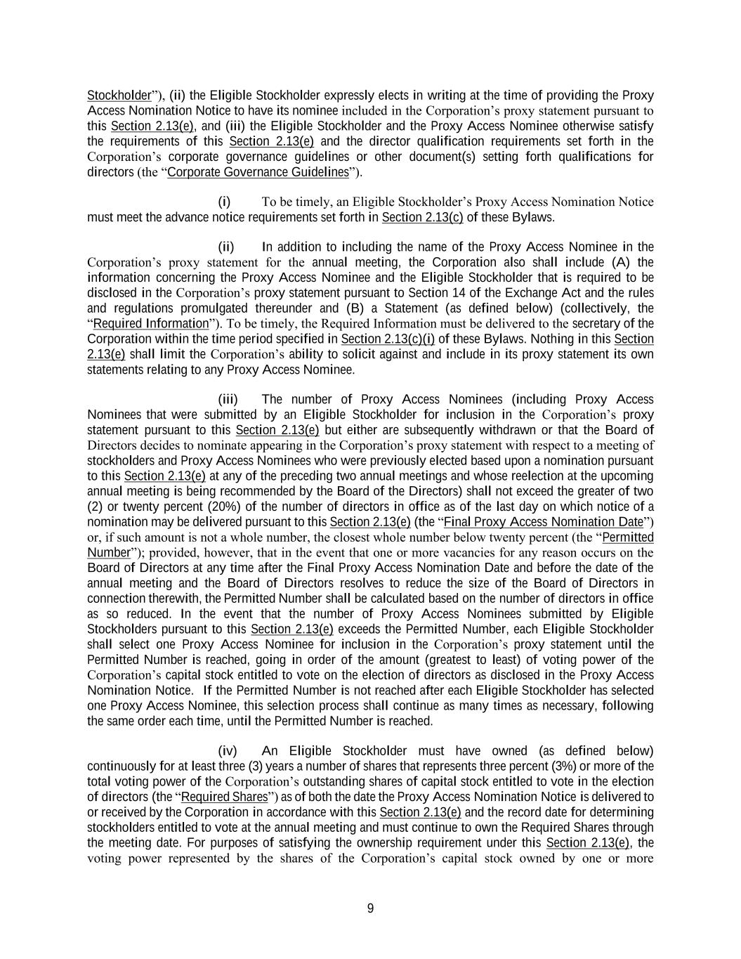 9 Stockholder”), (ii) the Eligible Stockholder expressly elects in writing at the time of providing the Proxy Access Nomination Notice to have its nominee included in the Corporation’s proxy statement pursuant to this Section 2.13(e), and (iii) the Eligible Stockholder and the Proxy Access Nominee otherwise satisfy the requirements of this Section 2.13(e) and the director qualification requirements set forth in the Corporation’s corporate governance guidelines or other document(s) setting forth qualifications for directors (the “Corporate Governance Guidelines”). (i) To be timely, an Eligible Stockholder’s Proxy Access Nomination Notice must meet the advance notice requirements set forth in Section 2.13(c) of these Bylaws. (ii) In addition to including the name of the Proxy Access Nominee in the Corporation’s proxy statement for the annual meeting, the Corporation also shall include (A) the information concerning the Proxy Access Nominee and the Eligible Stockholder that is required to be disclosed in the Corporation’s proxy statement pursuant to Section 14 of the Exchange Act and the rules and regulations promulgated thereunder and (B) a Statement (as defined below) (collectively, the “Required Information”). To be timely, the Required Information must be delivered to the secretary of the Corporation within the time period specified in Section 2.13(c)(i) of these Bylaws. Nothing in this Section 2.13(e) shall limit the Corporation’s ability to solicit against and include in its proxy statement its own statements relating to any Proxy Access Nominee. (iii) The number of Proxy Access Nominees (including Proxy Access Nominees that were submitted by an Eligible Stockholder for inclusion in the Corporation’s proxy statement pursuant to this Section 2.13(e) but either are subsequently withdrawn or that the Board of Directors decides to nominate appearing in the Corporation’s proxy statement with respect to a meeting of stockholders and Proxy Access Nominees who were previously elected based upon a nomination pursuant to this Section 2.13(e) at any of the preceding two annual meetings and whose reelection at the upcoming annual meeting is being recommended by the Board of the Directors) shall not exceed the greater of two (2) or twenty percent (20%) of the number of directors in office as of the last day on which notice of a nomination may be delivered pursuant to this Section 2.13(e) (the “Final Proxy Access Nomination Date”) or, if such amount is not a whole number, the closest whole number below twenty percent (the “Permitted Number”); provided, however, that in the event that one or more vacancies for any reason occurs on the Board of Directors at any time after the Final Proxy Access Nomination Date and before the date of the annual meeting and the Board of Directors resolves to reduce the size of the Board of Directors in connection therewith, the Permitted Number shall be calculated based on the number of directors in office as so reduced. In the event that the number of Proxy Access Nominees submitted by Eligible Stockholders pursuant to this Section 2.13(e) exceeds the Permitted Number, each Eligible Stockholder shall select one Proxy Access Nominee for inclusion in the Corporation’s proxy statement until the Permitted Number is reached, going in order of the amount (greatest to least) of voting power of the Corporation’s capital stock entitled to vote on the election of directors as disclosed in the Proxy Access Nomination Notice. If the Permitted Number is not reached after each Eligible Stockholder has selected one Proxy Access Nominee, this selection process shall continue as many times as necessary, following the same order each time, until the Permitted Number is reached. (iv) An Eligible Stockholder must have owned (as defined below) continuously for at least three (3) years a number of shares that represents three percent (3%) or more of the total voting power of the Corporation’s outstanding shares of capital stock entitled to vote in the election of directors (the “Required Shares”) as of both the date the Proxy Access Nomination Notice is delivered to or received by the Corporation in accordance with this Section 2.13(e) and the record date for determining stockholders entitled to vote at the annual meeting and must continue to own the Required Shares through the meeting date. For purposes of satisfying the ownership requirement under this Section 2.13(e), the voting power represented by the shares of the Corporation’s capital stock owned by one or more