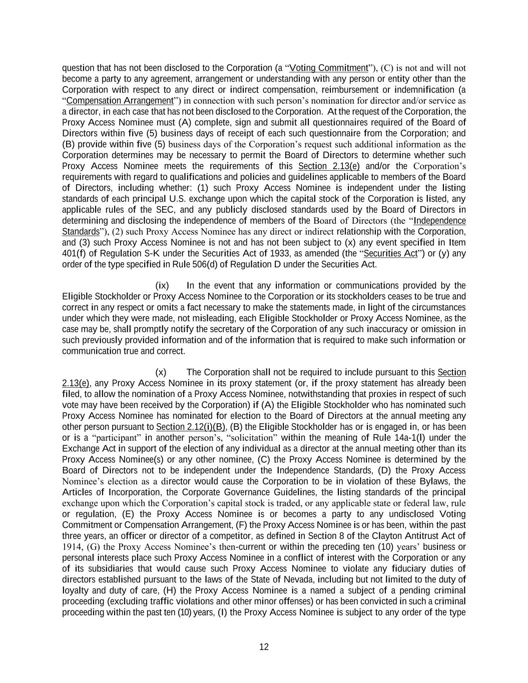 12 question that has not been disclosed to the Corporation (a “Voting Commitment”), (C) is not and will not become a party to any agreement, arrangement or understanding with any person or entity other than the Corporation with respect to any direct or indirect compensation, reimbursement or indemnification (a “Compensation Arrangement”) in connection with such person’s nomination for director and/or service as a director, in each case that has not been disclosed to the Corporation. At the request of the Corporation, the Proxy Access Nominee must (A) complete, sign and submit all questionnaires required of the Board of Directors within five (5) business days of receipt of each such questionnaire from the Corporation; and (B) provide within five (5) business days of the Corporation’s request such additional information as the Corporation determines may be necessary to permit the Board of Directors to determine whether such Proxy Access Nominee meets the requirements of this Section 2.13(e) and/or the Corporation’s requirements with regard to qualifications and policies and guidelines applicable to members of the Board of Directors, including whether: (1) such Proxy Access Nominee is independent under the listing standards of each principal U.S. exchange upon which the capital stock of the Corporation is listed, any applicable rules of the SEC, and any publicly disclosed standards used by the Board of Directors in determining and disclosing the independence of members of the Board of Directors (the “Independence Standards”), (2) such Proxy Access Nominee has any direct or indirect relationship with the Corporation, and (3) such Proxy Access Nominee is not and has not been subject to (x) any event specified in Item 401(f) of Regulation S-K under the Securities Act of 1933, as amended (the “Securities Act”) or (y) any order of the type specified in Rule 506(d) of Regulation D under the Securities Act. (ix) In the event that any information or communications provided by the Eligible Stockholder or Proxy Access Nominee to the Corporation or its stockholders ceases to be true and correct in any respect or omits a fact necessary to make the statements made, in light of the circumstances under which they were made, not misleading, each Eligible Stockholder or Proxy Access Nominee, as the case may be, shall promptly notify the secretary of the Corporation of any such inaccuracy or omission in such previously provided information and of the information that is required to make such information or communication true and correct. (x) The Corporation shall not be required to include pursuant to this Section 2.13(e), any Proxy Access Nominee in its proxy statement (or, if the proxy statement has already been filed, to allow the nomination of a Proxy Access Nominee, notwithstanding that proxies in respect of such vote may have been received by the Corporation) if (A) the Eligible Stockholder who has nominated such Proxy Access Nominee has nominated for election to the Board of Directors at the annual meeting any other person pursuant to Section 2.12(i)(B), (B) the Eligible Stockholder has or is engaged in, or has been or is a “participant” in another person’s, “solicitation” within the meaning of Rule 14a-1(l) under the Exchange Act in support of the election of any individual as a director at the annual meeting other than its Proxy Access Nominee(s) or any other nominee, (C) the Proxy Access Nominee is determined by the Board of Directors not to be independent under the Independence Standards, (D) the Proxy Access Nominee’s election as a director would cause the Corporation to be in violation of these Bylaws, the Articles of Incorporation, the Corporate Governance Guidelines, the listing standards of the principal exchange upon which the Corporation’s capital stock is traded, or any applicable state or federal law, rule or regulation, (E) the Proxy Access Nominee is or becomes a party to any undisclosed Voting Commitment or Compensation Arrangement, (F) the Proxy Access Nominee is or has been, within the past three years, an officer or director of a competitor, as defined in Section 8 of the Clayton Antitrust Act of 1914, (G) the Proxy Access Nominee’s then-current or within the preceding ten (10) years’ business or personal interests place such Proxy Access Nominee in a conflict of interest with the Corporation or any of its subsidiaries that would cause such Proxy Access Nominee to violate any fiduciary duties of directors established pursuant to the laws of the State of Nevada, including but not limited to the duty of loyalty and duty of care, (H) the Proxy Access Nominee is a named a subject of a pending criminal proceeding (excluding traffic violations and other minor offenses) or has been convicted in such a criminal proceeding within the past ten (10) years, (I) the Proxy Access Nominee is subject to any order of the type