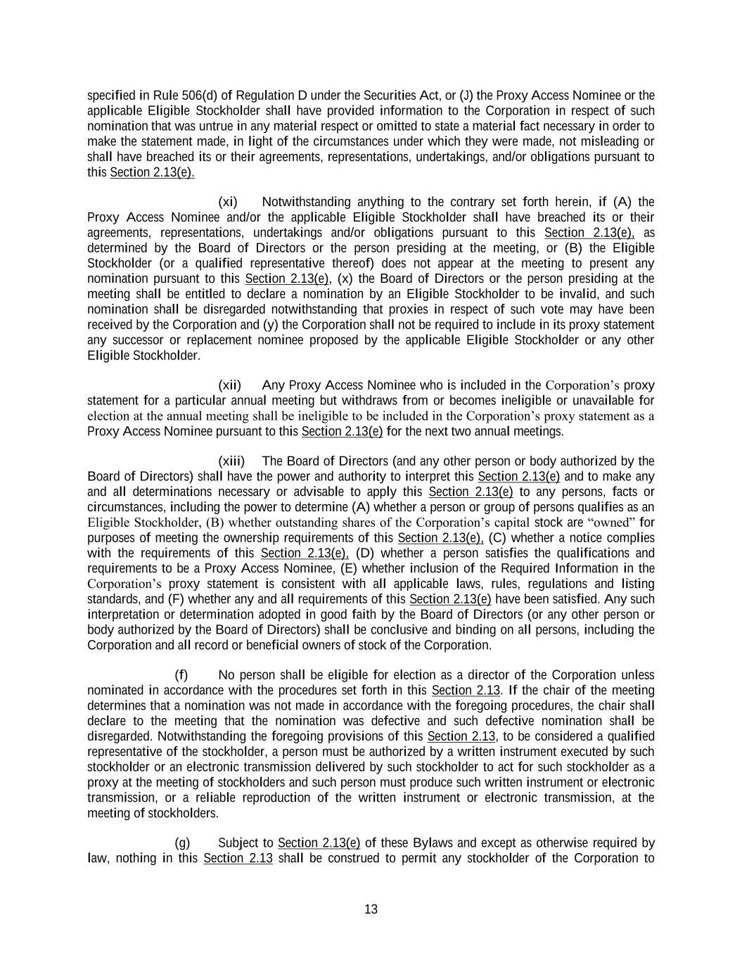 13 specified in Rule 506(d) of Regulation D under the Securities Act, or (J) the Proxy Access Nominee or the applicable Eligible Stockholder shall have provided information to the Corporation in respect of such nomination that was untrue in any material respect or omitted to state a material fact necessary in order to make the statement made, in light of the circumstances under which they were made, not misleading or shall have breached its or their agreements, representations, undertakings, and/or obligations pursuant to this Section 2.13(e). (xi) Notwithstanding anything to the contrary set forth herein, if (A) the Proxy Access Nominee and/or the applicable Eligible Stockholder shall have breached its or their agreements, representations, undertakings and/or obligations pursuant to this Section 2.13(e), as determined by the Board of Directors or the person presiding at the meeting, or (B) the Eligible Stockholder (or a qualified representative thereof) does not appear at the meeting to present any nomination pursuant to this Section 2.13(e), (x) the Board of Directors or the person presiding at the meeting shall be entitled to declare a nomination by an Eligible Stockholder to be invalid, and such nomination shall be disregarded notwithstanding that proxies in respect of such vote may have been received by the Corporation and (y) the Corporation shall not be required to include in its proxy statement any successor or replacement nominee proposed by the applicable Eligible Stockholder or any other Eligible Stockholder. (xii) Any Proxy Access Nominee who is included in the Corporation’s proxy statement for a particular annual meeting but withdraws from or becomes ineligible or unavailable for election at the annual meeting shall be ineligible to be included in the Corporation’s proxy statement as a Proxy Access Nominee pursuant to this Section 2.13(e) for the next two annual meetings. (xiii) The Board of Directors (and any other person or body authorized by the Board of Directors) shall have the power and authority to interpret this Section 2.13(e) and to make any and all determinations necessary or advisable to apply this Section 2.13(e) to any persons, facts or circumstances, including the power to determine (A) whether a person or group of persons qualifies as an Eligible Stockholder, (B) whether outstanding shares of the Corporation’s capital stock are “owned” for purposes of meeting the ownership requirements of this Section 2.13(e), (C) whether a notice complies with the requirements of this Section 2.13(e), (D) whether a person satisfies the qualifications and requirements to be a Proxy Access Nominee, (E) whether inclusion of the Required Information in the Corporation’s proxy statement is consistent with all applicable laws, rules, regulations and listing standards, and (F) whether any and all requirements of this Section 2.13(e) have been satisfied. Any such interpretation or determination adopted in good faith by the Board of Directors (or any other person or body authorized by the Board of Directors) shall be conclusive and binding on all persons, including the Corporation and all record or beneficial owners of stock of the Corporation. (f) No person shall be eligible for election as a director of the Corporation unless nominated in accordance with the procedures set forth in this Section 2.13. If the chair of the meeting determines that a nomination was not made in accordance with the foregoing procedures, the chair shall declare to the meeting that the nomination was defective and such defective nomination shall be disregarded. Notwithstanding the foregoing provisions of this Section 2.13, to be considered a qualified representative of the stockholder, a person must be authorized by a written instrument executed by such stockholder or an electronic transmission delivered by such stockholder to act for such stockholder as a proxy at the meeting of stockholders and such person must produce such written instrument or electronic transmission, or a reliable reproduction of the written instrument or electronic transmission, at the meeting of stockholders. (g) Subject to Section 2.13(e) of these Bylaws and except as otherwise required by law, nothing in this Section 2.13 shall be construed to permit any stockholder of the Corporation to