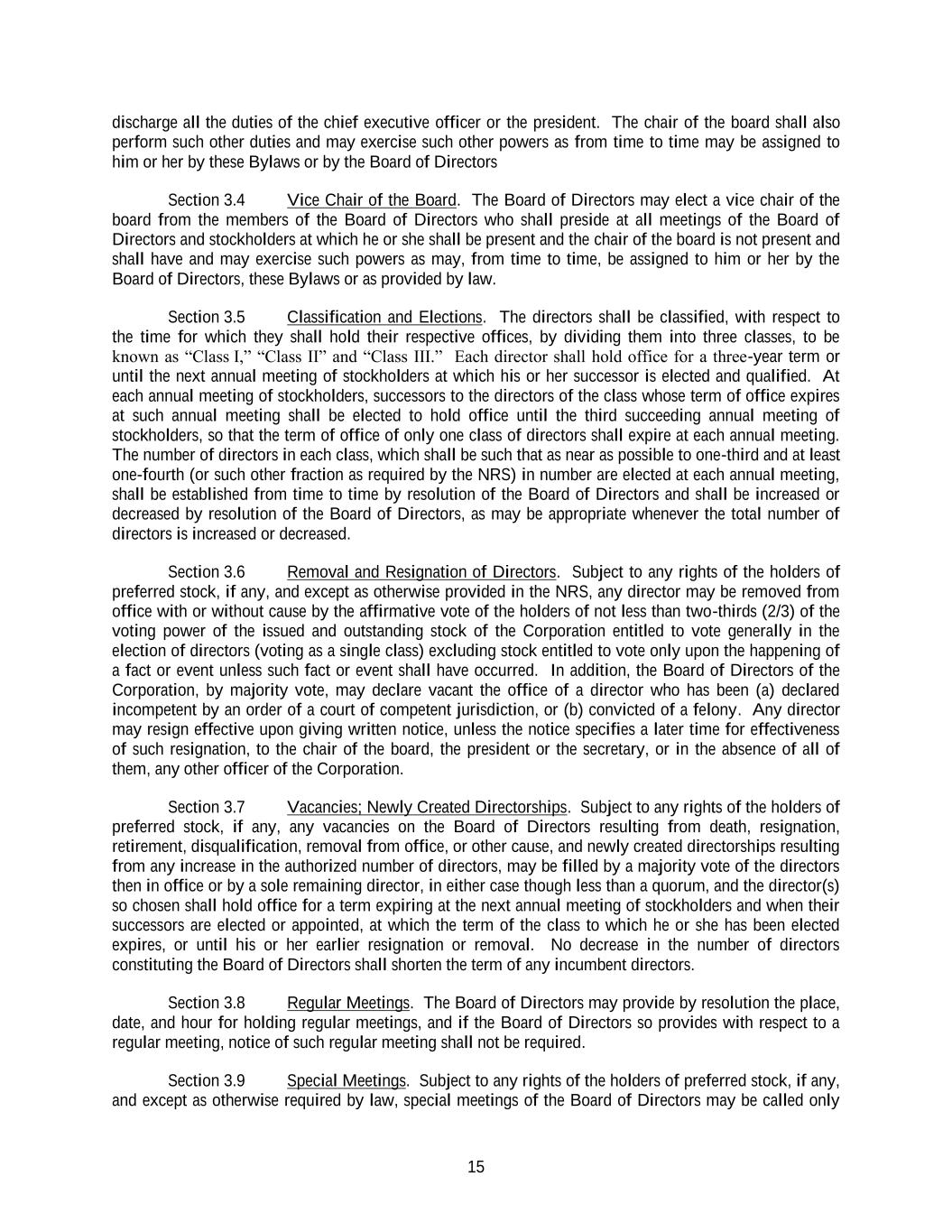 15 discharge all the duties of the chief executive officer or the president. The chair of the board shall also perform such other duties and may exercise such other powers as from time to time may be assigned to him or her by these Bylaws or by the Board of Directors Section 3.4 Vice Chair of the Board. The Board of Directors may elect a vice chair of the board from the members of the Board of Directors who shall preside at all meetings of the Board of Directors and stockholders at which he or she shall be present and the chair of the board is not present and shall have and may exercise such powers as may, from time to time, be assigned to him or her by the Board of Directors, these Bylaws or as provided by law. Section 3.5 Classification and Elections. The directors shall be classified, with respect to the time for which they shall hold their respective offices, by dividing them into three classes, to be known as “Class I,” “Class II” and “Class III.” Each director shall hold office for a three-year term or until the next annual meeting of stockholders at which his or her successor is elected and qualified. At each annual meeting of stockholders, successors to the directors of the class whose term of office expires at such annual meeting shall be elected to hold office until the third succeeding annual meeting of stockholders, so that the term of office of only one class of directors shall expire at each annual meeting. The number of directors in each class, which shall be such that as near as possible to one-third and at least one-fourth (or such other fraction as required by the NRS) in number are elected at each annual meeting, shall be established from time to time by resolution of the Board of Directors and shall be increased or decreased by resolution of the Board of Directors, as may be appropriate whenever the total number of directors is increased or decreased. Section 3.6 Removal and Resignation of Directors. Subject to any rights of the holders of preferred stock, if any, and except as otherwise provided in the NRS, any director may be removed from office with or without cause by the affirmative vote of the holders of not less than two-thirds (2/3) of the voting power of the issued and outstanding stock of the Corporation entitled to vote generally in the election of directors (voting as a single class) excluding stock entitled to vote only upon the happening of a fact or event unless such fact or event shall have occurred. In addition, the Board of Directors of the Corporation, by majority vote, may declare vacant the office of a director who has been (a) declared incompetent by an order of a court of competent jurisdiction, or (b) convicted of a felony. Any director may resign effective upon giving written notice, unless the notice specifies a later time for effectiveness of such resignation, to the chair of the board, the president or the secretary, or in the absence of all of them, any other officer of the Corporation. Section 3.7 Vacancies; Newly Created Directorships. Subject to any rights of the holders of preferred stock, if any, any vacancies on the Board of Directors resulting from death, resignation, retirement, disqualification, removal from office, or other cause, and newly created directorships resulting from any increase in the authorized number of directors, may be filled by a majority vote of the directors then in office or by a sole remaining director, in either case though less than a quorum, and the director(s) so chosen shall hold office for a term expiring at the next annual meeting of stockholders and when their successors are elected or appointed, at which the term of the class to which he or she has been elected expires, or until his or her earlier resignation or removal. No decrease in the number of directors constituting the Board of Directors shall shorten the term of any incumbent directors. Section 3.8 Regular Meetings. The Board of Directors may provide by resolution the place, date, and hour for holding regular meetings, and if the Board of Directors so provides with respect to a regular meeting, notice of such regular meeting shall not be required. Section 3.9 Special Meetings. Subject to any rights of the holders of preferred stock, if any, and except as otherwise required by law, special meetings of the Board of Directors may be called only