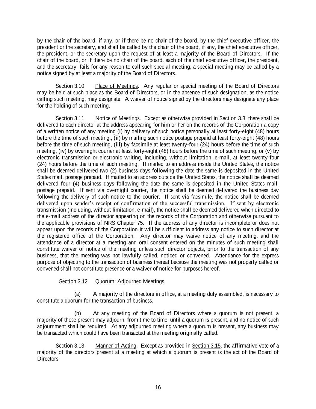 16 by the chair of the board, if any, or if there be no chair of the board, by the chief executive officer, the president or the secretary, and shall be called by the chair of the board, if any, the chief executive officer, the president, or the secretary upon the request of at least a majority of the Board of Directors. If the chair of the board, or if there be no chair of the board, each of the chief executive officer, the president, and the secretary, fails for any reason to call such special meeting, a special meeting may be called by a notice signed by at least a majority of the Board of Directors. Section 3.10 Place of Meetings. Any regular or special meeting of the Board of Directors may be held at such place as the Board of Directors, or in the absence of such designation, as the notice calling such meeting, may designate. A waiver of notice signed by the directors may designate any place for the holding of such meeting. Section 3.11 Notice of Meetings. Except as otherwise provided in Section 3.8, there shall be delivered to each director at the address appearing for him or her on the records of the Corporation a copy of a written notice of any meeting (i) by delivery of such notice personally at least forty-eight (48) hours before the time of such meeting,, (ii) by mailing such notice postage prepaid at least forty-eight (48) hours before the time of such meeting, (iii) by facsimile at least twenty-four (24) hours before the time of such meeting, (iv) by overnight courier at least forty-eight (48) hours before the time of such meeting, or (v) by electronic transmission or electronic writing, including, without limitation, e-mail, at least twenty-four (24) hours before the time of such meeting. If mailed to an address inside the United States, the notice shall be deemed delivered two (2) business days following the date the same is deposited in the United States mail, postage prepaid. If mailed to an address outside the United States, the notice shall be deemed delivered four (4) business days following the date the same is deposited in the United States mail, postage prepaid. If sent via overnight courier, the notice shall be deemed delivered the business day following the delivery of such notice to the courier. If sent via facsimile, the notice shall be deemed delivered upon sender’s receipt of confirmation of the successful transmission. If sent by electronic transmission (including, without limitation, e-mail), the notice shall be deemed delivered when directed to the e-mail address of the director appearing on the records of the Corporation and otherwise pursuant to the applicable provisions of NRS Chapter 75. If the address of any director is incomplete or does not appear upon the records of the Corporation it will be sufficient to address any notice to such director at the registered office of the Corporation. Any director may waive notice of any meeting, and the attendance of a director at a meeting and oral consent entered on the minutes of such meeting shall constitute waiver of notice of the meeting unless such director objects, prior to the transaction of any business, that the meeting was not lawfully called, noticed or convened. Attendance for the express purpose of objecting to the transaction of business thereat because the meeting was not properly called or convened shall not constitute presence or a waiver of notice for purposes hereof. Section 3.12 Quorum; Adjourned Meetings. (a) A majority of the directors in office, at a meeting duly assembled, is necessary to constitute a quorum for the transaction of business. (b) At any meeting of the Board of Directors where a quorum is not present, a majority of those present may adjourn, from time to time, until a quorum is present, and no notice of such adjournment shall be required. At any adjourned meeting where a quorum is present, any business may be transacted which could have been transacted at the meeting originally called. Section 3.13 Manner of Acting. Except as provided in Section 3.15, the affirmative vote of a majority of the directors present at a meeting at which a quorum is present is the act of the Board of Directors.