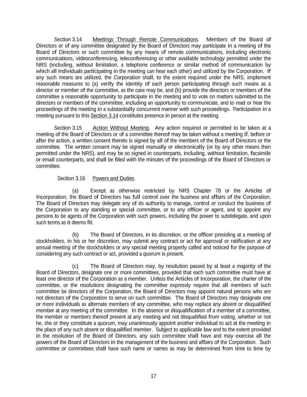17 Section 3.14 Meetings Through Remote Communications. Members of the Board of Directors or of any committee designated by the Board of Directors may participate in a meeting of the Board of Directors or such committee by any means of remote communications, including electronic communications, videoconferencing, teleconferencing or other available technology permitted under the NRS (including, without limitation, a telephone conference or similar method of communication by which all individuals participating in the meeting can hear each other) and utilized by the Corporation. If any such means are utilized, the Corporation shall, to the extent required under the NRS, implement reasonable measures to (a) verify the identity of each person participating through such means as a director or member of the committee, as the case may be, and (b) provide the directors or members of the committee a reasonable opportunity to participate in the meeting and to vote on matters submitted to the directors or members of the committee, including an opportunity to communicate, and to read or hear the proceedings of the meeting in a substantially concurrent manner with such proceedings. Participation in a meeting pursuant to this Section 3.14 constitutes presence in person at the meeting. Section 3.15 Action Without Meeting. Any action required or permitted to be taken at a meeting of the Board of Directors or of a committee thereof may be taken without a meeting if, before or after the action, a written consent thereto is signed by all of the members of the Board of Directors or the committee. The written consent may be signed manually or electronically (or by any other means then permitted under the NRS), and may be so signed in counterparts, including, without limitation, facsimile or email counterparts, and shall be filed with the minutes of the proceedings of the Board of Directors or committee. Section 3.16 Powers and Duties. (a) Except as otherwise restricted by NRS Chapter 78 or the Articles of Incorporation, the Board of Directors has full control over the business and affairs of the Corporation. The Board of Directors may delegate any of its authority to manage, control or conduct the business of the Corporation to any standing or special committee, or to any officer or agent, and to appoint any persons to be agents of the Corporation with such powers, including the power to subdelegate, and upon such terms as it deems fit. (b) The Board of Directors, in its discretion, or the officer presiding at a meeting of stockholders, in his or her discretion, may submit any contract or act for approval or ratification at any annual meeting of the stockholders or any special meeting properly called and noticed for the purpose of considering any such contract or act, provided a quorum is present. (c) The Board of Directors may, by resolution passed by at least a majority of the Board of Directors, designate one or more committees, provided that each such committee must have at least one director of the Corporation as a member. Unless the Articles of Incorporation, the charter of the committee, or the resolutions designating the committee expressly require that all members of such committee be directors of the Corporation, the Board of Directors may appoint natural persons who are not directors of the Corporation to serve on such committee. The Board of Directors may designate one or more individuals as alternate members of any committee, who may replace any absent or disqualified member at any meeting of the committee. In the absence or disqualification of a member of a committee, the member or members thereof present at any meeting and not disqualified from voting, whether or not he, she or they constitute a quorum, may unanimously appoint another individual to act at the meeting in the place of any such absent or disqualified member. Subject to applicable law and to the extent provided in the resolution of the Board of Directors, any such committee shall have and may exercise all the powers of the Board of Directors in the management of the business and affairs of the Corporation. Such committee or committees shall have such name or names as may be determined from time to time by