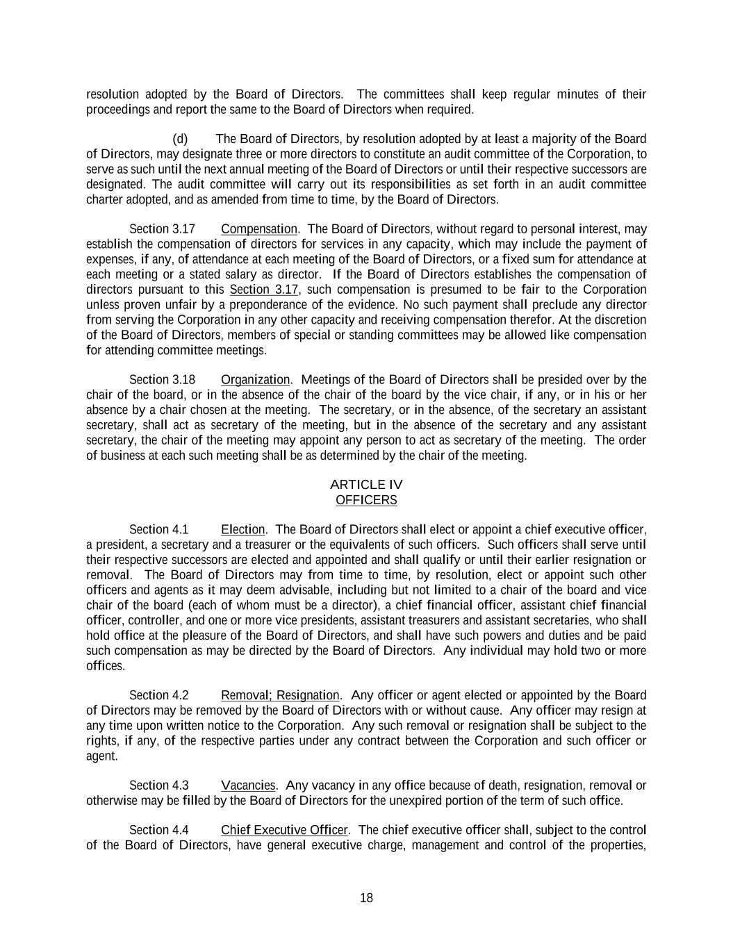 18 resolution adopted by the Board of Directors. The committees shall keep regular minutes of their proceedings and report the same to the Board of Directors when required. (d) The Board of Directors, by resolution adopted by at least a majority of the Board of Directors, may designate three or more directors to constitute an audit committee of the Corporation, to serve as such until the next annual meeting of the Board of Directors or until their respective successors are designated. The audit committee will carry out its responsibilities as set forth in an audit committee charter adopted, and as amended from time to time, by the Board of Directors. Section 3.17 Compensation. The Board of Directors, without regard to personal interest, may establish the compensation of directors for services in any capacity, which may include the payment of expenses, if any, of attendance at each meeting of the Board of Directors, or a fixed sum for attendance at each meeting or a stated salary as director. If the Board of Directors establishes the compensation of directors pursuant to this Section 3.17, such compensation is presumed to be fair to the Corporation unless proven unfair by a preponderance of the evidence. No such payment shall preclude any director from serving the Corporation in any other capacity and receiving compensation therefor. At the discretion of the Board of Directors, members of special or standing committees may be allowed like compensation for attending committee meetings. Section 3.18 Organization. Meetings of the Board of Directors shall be presided over by the chair of the board, or in the absence of the chair of the board by the vice chair, if any, or in his or her absence by a chair chosen at the meeting. The secretary, or in the absence, of the secretary an assistant secretary, shall act as secretary of the meeting, but in the absence of the secretary and any assistant secretary, the chair of the meeting may appoint any person to act as secretary of the meeting. The order of business at each such meeting shall be as determined by the chair of the meeting. ARTICLE IV OFFICERS Section 4.1 Election. The Board of Directors shall elect or appoint a chief executive officer, a president, a secretary and a treasurer or the equivalents of such officers. Such officers shall serve until their respective successors are elected and appointed and shall qualify or until their earlier resignation or removal. The Board of Directors may from time to time, by resolution, elect or appoint such other officers and agents as it may deem advisable, including but not limited to a chair of the board and vice chair of the board (each of whom must be a director), a chief financial officer, assistant chief financial officer, controller, and one or more vice presidents, assistant treasurers and assistant secretaries, who shall hold office at the pleasure of the Board of Directors, and shall have such powers and duties and be paid such compensation as may be directed by the Board of Directors. Any individual may hold two or more offices. Section 4.2 Removal; Resignation. Any officer or agent elected or appointed by the Board of Directors may be removed by the Board of Directors with or without cause. Any officer may resign at any time upon written notice to the Corporation. Any such removal or resignation shall be subject to the rights, if any, of the respective parties under any contract between the Corporation and such officer or agent. Section 4.3 Vacancies. Any vacancy in any office because of death, resignation, removal or otherwise may be filled by the Board of Directors for the unexpired portion of the term of such office. Section 4.4 Chief Executive Officer. The chief executive officer shall, subject to the control of the Board of Directors, have general executive charge, management and control of the properties,