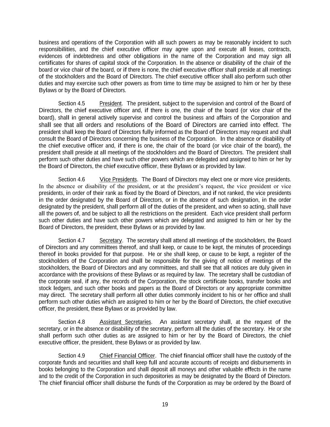 19 business and operations of the Corporation with all such powers as may be reasonably incident to such responsibilities, and the chief executive officer may agree upon and execute all leases, contracts, evidences of indebtedness and other obligations in the name of the Corporation and may sign all certificates for shares of capital stock of the Corporation. In the absence or disability of the chair of the board or vice chair of the board, or if there is none, the chief executive officer shall preside at all meetings of the stockholders and the Board of Directors. The chief executive officer shall also perform such other duties and may exercise such other powers as from time to time may be assigned to him or her by these Bylaws or by the Board of Directors. Section 4.5 President. The president, subject to the supervision and control of the Board of Directors, the chief executive officer and, if there is one, the chair of the board (or vice chair of the board), shall in general actively supervise and control the business and affairs of the Corporation and shall see that all orders and resolutions of the Board of Directors are carried into effect. The president shall keep the Board of Directors fully informed as the Board of Directors may request and shall consult the Board of Directors concerning the business of the Corporation. In the absence or disability of the chief executive officer and, if there is one, the chair of the board (or vice chair of the board), the president shall preside at all meetings of the stockholders and the Board of Directors. The president shall perform such other duties and have such other powers which are delegated and assigned to him or her by the Board of Directors, the chief executive officer, these Bylaws or as provided by law. Section 4.6 Vice Presidents. The Board of Directors may elect one or more vice presidents. In the absence or disability of the president, or at the president’s request, the vice president or vice presidents, in order of their rank as fixed by the Board of Directors, and if not ranked, the vice presidents in the order designated by the Board of Directors, or in the absence of such designation, in the order designated by the president, shall perform all of the duties of the president, and when so acting, shall have all the powers of, and be subject to all the restrictions on the president. Each vice president shall perform such other duties and have such other powers which are delegated and assigned to him or her by the Board of Directors, the president, these Bylaws or as provided by law. Section 4.7 Secretary. The secretary shall attend all meetings of the stockholders, the Board of Directors and any committees thereof, and shall keep, or cause to be kept, the minutes of proceedings thereof in books provided for that purpose. He or she shall keep, or cause to be kept, a register of the stockholders of the Corporation and shall be responsible for the giving of notice of meetings of the stockholders, the Board of Directors and any committees, and shall see that all notices are duly given in accordance with the provisions of these Bylaws or as required by law. The secretary shall be custodian of the corporate seal, if any, the records of the Corporation, the stock certificate books, transfer books and stock ledgers, and such other books and papers as the Board of Directors or any appropriate committee may direct. The secretary shall perform all other duties commonly incident to his or her office and shall perform such other duties which are assigned to him or her by the Board of Directors, the chief executive officer, the president, these Bylaws or as provided by law. Section 4.8 Assistant Secretaries. An assistant secretary shall, at the request of the secretary, or in the absence or disability of the secretary, perform all the duties of the secretary. He or she shall perform such other duties as are assigned to him or her by the Board of Directors, the chief executive officer, the president, these Bylaws or as provided by law. Section 4.9 Chief Financial Officer. The chief financial officer shall have the custody of the corporate funds and securities and shall keep full and accurate accounts of receipts and disbursements in books belonging to the Corporation and shall deposit all moneys and other valuable effects in the name and to the credit of the Corporation in such depositories as may be designated by the Board of Directors. The chief financial officer shall disburse the funds of the Corporation as may be ordered by the Board of