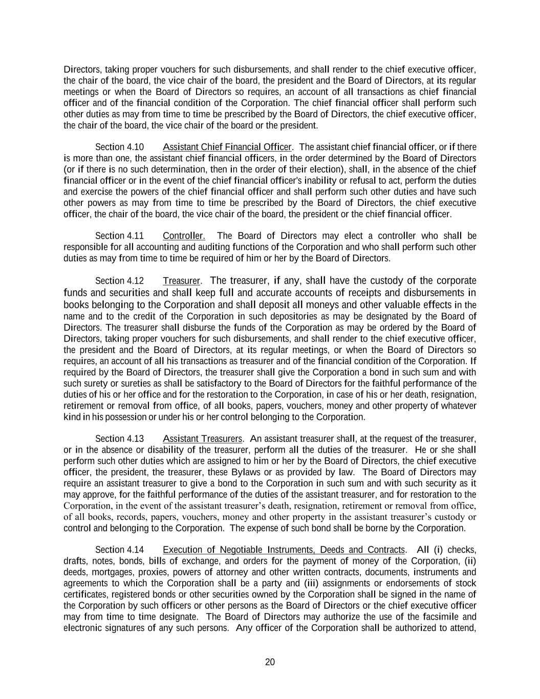 20 Directors, taking proper vouchers for such disbursements, and shall render to the chief executive officer, the chair of the board, the vice chair of the board, the president and the Board of Directors, at its regular meetings or when the Board of Directors so requires, an account of all transactions as chief financial officer and of the financial condition of the Corporation. The chief financial officer shall perform such other duties as may from time to time be prescribed by the Board of Directors, the chief executive officer, the chair of the board, the vice chair of the board or the president. Section 4.10 Assistant Chief Financial Officer. The assistant chief financial officer, or if there is more than one, the assistant chief financial officers, in the order determined by the Board of Directors (or if there is no such determination, then in the order of their election), shall, in the absence of the chief financial officer or in the event of the chief financial officer's inability or refusal to act, perform the duties and exercise the powers of the chief financial officer and shall perform such other duties and have such other powers as may from time to time be prescribed by the Board of Directors, the chief executive officer, the chair of the board, the vice chair of the board, the president or the chief financial officer. Section 4.11 Controller. The Board of Directors may elect a controller who shall be responsible for all accounting and auditing functions of the Corporation and who shall perform such other duties as may from time to time be required of him or her by the Board of Directors. Section 4.12 Treasurer. The treasurer, if any, shall have the custody of the corporate funds and securities and shall keep full and accurate accounts of receipts and disbursements in books belonging to the Corporation and shall deposit all moneys and other valuable effects in the name and to the credit of the Corporation in such depositories as may be designated by the Board of Directors. The treasurer shall disburse the funds of the Corporation as may be ordered by the Board of Directors, taking proper vouchers for such disbursements, and shall render to the chief executive officer, the president and the Board of Directors, at its regular meetings, or when the Board of Directors so requires, an account of all his transactions as treasurer and of the financial condition of the Corporation. If required by the Board of Directors, the treasurer shall give the Corporation a bond in such sum and with such surety or sureties as shall be satisfactory to the Board of Directors for the faithful performance of the duties of his or her office and for the restoration to the Corporation, in case of his or her death, resignation, retirement or removal from office, of all books, papers, vouchers, money and other property of whatever kind in his possession or under his or her control belonging to the Corporation. Section 4.13 Assistant Treasurers. An assistant treasurer shall, at the request of the treasurer, or in the absence or disability of the treasurer, perform all the duties of the treasurer. He or she shall perform such other duties which are assigned to him or her by the Board of Directors, the chief executive officer, the president, the treasurer, these Bylaws or as provided by law. The Board of Directors may require an assistant treasurer to give a bond to the Corporation in such sum and with such security as it may approve, for the faithful performance of the duties of the assistant treasurer, and for restoration to the Corporation, in the event of the assistant treasurer’s death, resignation, retirement or removal from office, of all books, records, papers, vouchers, money and other property in the assistant treasurer’s custody or control and belonging to the Corporation. The expense of such bond shall be borne by the Corporation. Section 4.14 Execution of Negotiable Instruments, Deeds and Contracts. All (i) checks, drafts, notes, bonds, bills of exchange, and orders for the payment of money of the Corporation, (ii) deeds, mortgages, proxies, powers of attorney and other written contracts, documents, instruments and agreements to which the Corporation shall be a party and (iii) assignments or endorsements of stock certificates, registered bonds or other securities owned by the Corporation shall be signed in the name of the Corporation by such officers or other persons as the Board of Directors or the chief executive officer may from time to time designate. The Board of Directors may authorize the use of the facsimile and electronic signatures of any such persons. Any officer of the Corporation shall be authorized to attend,