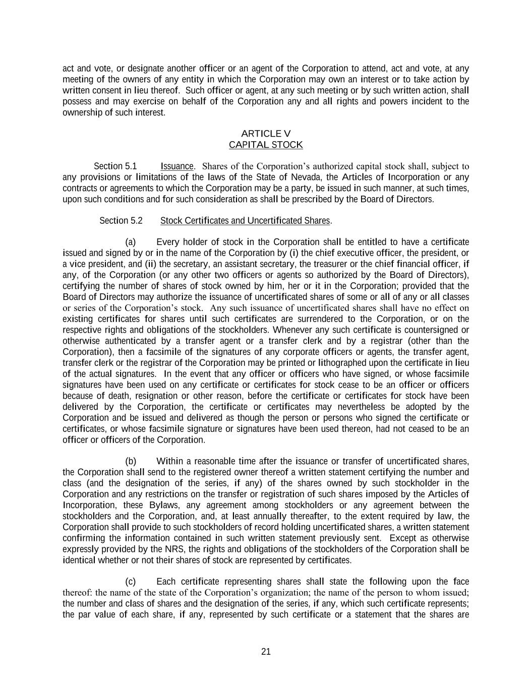 21 act and vote, or designate another officer or an agent of the Corporation to attend, act and vote, at any meeting of the owners of any entity in which the Corporation may own an interest or to take action by written consent in lieu thereof. Such officer or agent, at any such meeting or by such written action, shall possess and may exercise on behalf of the Corporation any and all rights and powers incident to the ownership of such interest. ARTICLE V CAPITAL STOCK Section 5.1 Issuance. Shares of the Corporation’s authorized capital stock shall, subject to any provisions or limitations of the laws of the State of Nevada, the Articles of Incorporation or any contracts or agreements to which the Corporation may be a party, be issued in such manner, at such times, upon such conditions and for such consideration as shall be prescribed by the Board of Directors. Section 5.2 Stock Certificates and Uncertificated Shares. (a) Every holder of stock in the Corporation shall be entitled to have a certificate issued and signed by or in the name of the Corporation by (i) the chief executive officer, the president, or a vice president, and (ii) the secretary, an assistant secretary, the treasurer or the chief financial officer, if any, of the Corporation (or any other two officers or agents so authorized by the Board of Directors), certifying the number of shares of stock owned by him, her or it in the Corporation; provided that the Board of Directors may authorize the issuance of uncertificated shares of some or all of any or all classes or series of the Corporation’s stock. Any such issuance of uncertificated shares shall have no effect on existing certificates for shares until such certificates are surrendered to the Corporation, or on the respective rights and obligations of the stockholders. Whenever any such certificate is countersigned or otherwise authenticated by a transfer agent or a transfer clerk and by a registrar (other than the Corporation), then a facsimile of the signatures of any corporate officers or agents, the transfer agent, transfer clerk or the registrar of the Corporation may be printed or lithographed upon the certificate in lieu of the actual signatures. In the event that any officer or officers who have signed, or whose facsimile signatures have been used on any certificate or certificates for stock cease to be an officer or officers because of death, resignation or other reason, before the certificate or certificates for stock have been delivered by the Corporation, the certificate or certificates may nevertheless be adopted by the Corporation and be issued and delivered as though the person or persons who signed the certificate or certificates, or whose facsimile signature or signatures have been used thereon, had not ceased to be an officer or officers of the Corporation. (b) Within a reasonable time after the issuance or transfer of uncertificated shares, the Corporation shall send to the registered owner thereof a written statement certifying the number and class (and the designation of the series, if any) of the shares owned by such stockholder in the Corporation and any restrictions on the transfer or registration of such shares imposed by the Articles of Incorporation, these Bylaws, any agreement among stockholders or any agreement between the stockholders and the Corporation, and, at least annually thereafter, to the extent required by law, the Corporation shall provide to such stockholders of record holding uncertificated shares, a written statement confirming the information contained in such written statement previously sent. Except as otherwise expressly provided by the NRS, the rights and obligations of the stockholders of the Corporation shall be identical whether or not their shares of stock are represented by certificates. (c) Each certificate representing shares shall state the following upon the face thereof: the name of the state of the Corporation’s organization; the name of the person to whom issued; the number and class of shares and the designation of the series, if any, which such certificate represents; the par value of each share, if any, represented by such certificate or a statement that the shares are