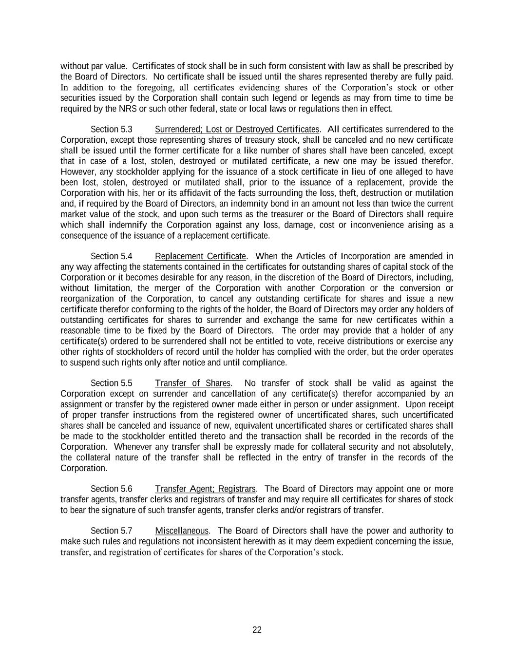 22 without par value. Certificates of stock shall be in such form consistent with law as shall be prescribed by the Board of Directors. No certificate shall be issued until the shares represented thereby are fully paid. In addition to the foregoing, all certificates evidencing shares of the Corporation’s stock or other securities issued by the Corporation shall contain such legend or legends as may from time to time be required by the NRS or such other federal, state or local laws or regulations then in effect. Section 5.3 Surrendered; Lost or Destroyed Certificates. All certificates surrendered to the Corporation, except those representing shares of treasury stock, shall be canceled and no new certificate shall be issued until the former certificate for a like number of shares shall have been canceled, except that in case of a lost, stolen, destroyed or mutilated certificate, a new one may be issued therefor. However, any stockholder applying for the issuance of a stock certificate in lieu of one alleged to have been lost, stolen, destroyed or mutilated shall, prior to the issuance of a replacement, provide the Corporation with his, her or its affidavit of the facts surrounding the loss, theft, destruction or mutilation and, if required by the Board of Directors, an indemnity bond in an amount not less than twice the current market value of the stock, and upon such terms as the treasurer or the Board of Directors shall require which shall indemnify the Corporation against any loss, damage, cost or inconvenience arising as a consequence of the issuance of a replacement certificate. Section 5.4 Replacement Certificate. When the Articles of Incorporation are amended in any way affecting the statements contained in the certificates for outstanding shares of capital stock of the Corporation or it becomes desirable for any reason, in the discretion of the Board of Directors, including, without limitation, the merger of the Corporation with another Corporation or the conversion or reorganization of the Corporation, to cancel any outstanding certificate for shares and issue a new certificate therefor conforming to the rights of the holder, the Board of Directors may order any holders of outstanding certificates for shares to surrender and exchange the same for new certificates within a reasonable time to be fixed by the Board of Directors. The order may provide that a holder of any certificate(s) ordered to be surrendered shall not be entitled to vote, receive distributions or exercise any other rights of stockholders of record until the holder has complied with the order, but the order operates to suspend such rights only after notice and until compliance. Section 5.5 Transfer of Shares. No transfer of stock shall be valid as against the Corporation except on surrender and cancellation of any certificate(s) therefor accompanied by an assignment or transfer by the registered owner made either in person or under assignment. Upon receipt of proper transfer instructions from the registered owner of uncertificated shares, such uncertificated shares shall be canceled and issuance of new, equivalent uncertificated shares or certificated shares shall be made to the stockholder entitled thereto and the transaction shall be recorded in the records of the Corporation. Whenever any transfer shall be expressly made for collateral security and not absolutely, the collateral nature of the transfer shall be reflected in the entry of transfer in the records of the Corporation. Section 5.6 Transfer Agent; Registrars. The Board of Directors may appoint one or more transfer agents, transfer clerks and registrars of transfer and may require all certificates for shares of stock to bear the signature of such transfer agents, transfer clerks and/or registrars of transfer. Section 5.7 Miscellaneous. The Board of Directors shall have the power and authority to make such rules and regulations not inconsistent herewith as it may deem expedient concerning the issue, transfer, and registration of certificates for shares of the Corporation’s stock.