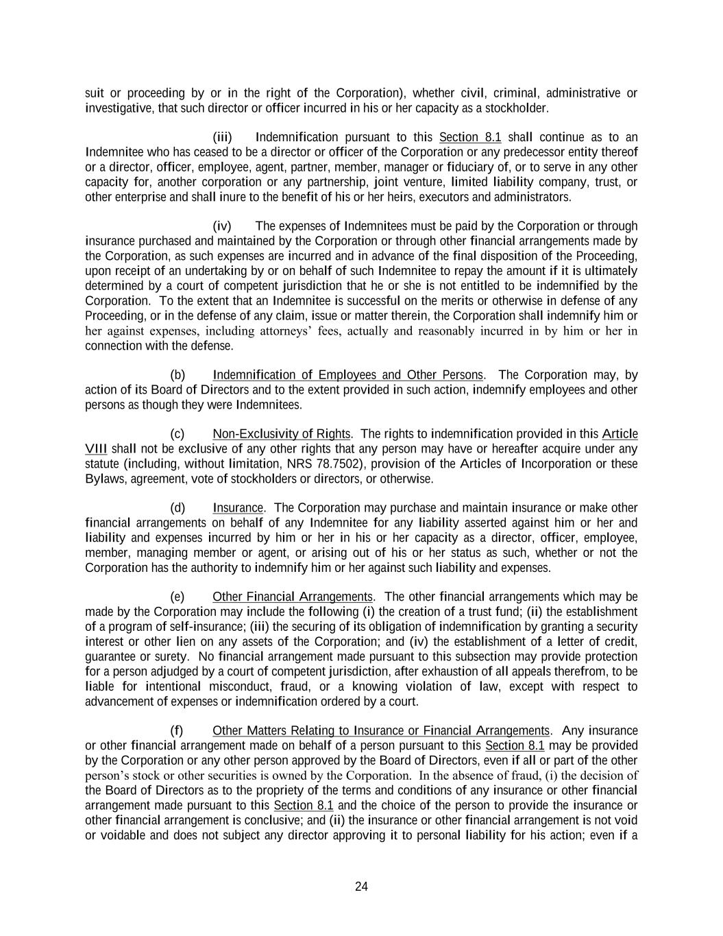 24 suit or proceeding by or in the right of the Corporation), whether civil, criminal, administrative or investigative, that such director or officer incurred in his or her capacity as a stockholder. (iii) Indemnification pursuant to this Section 8.1 shall continue as to an Indemnitee who has ceased to be a director or officer of the Corporation or any predecessor entity thereof or a director, officer, employee, agent, partner, member, manager or fiduciary of, or to serve in any other capacity for, another corporation or any partnership, joint venture, limited liability company, trust, or other enterprise and shall inure to the benefit of his or her heirs, executors and administrators. (iv) The expenses of Indemnitees must be paid by the Corporation or through insurance purchased and maintained by the Corporation or through other financial arrangements made by the Corporation, as such expenses are incurred and in advance of the final disposition of the Proceeding, upon receipt of an undertaking by or on behalf of such Indemnitee to repay the amount if it is ultimately determined by a court of competent jurisdiction that he or she is not entitled to be indemnified by the Corporation. To the extent that an Indemnitee is successful on the merits or otherwise in defense of any Proceeding, or in the defense of any claim, issue or matter therein, the Corporation shall indemnify him or her against expenses, including attorneys’ fees, actually and reasonably incurred in by him or her in connection with the defense. (b) Indemnification of Employees and Other Persons. The Corporation may, by action of its Board of Directors and to the extent provided in such action, indemnify employees and other persons as though they were Indemnitees. (c) Non-Exclusivity of Rights. The rights to indemnification provided in this Article VIII shall not be exclusive of any other rights that any person may have or hereafter acquire under any statute (including, without limitation, NRS 78.7502), provision of the Articles of Incorporation or these Bylaws, agreement, vote of stockholders or directors, or otherwise. (d) Insurance. The Corporation may purchase and maintain insurance or make other financial arrangements on behalf of any Indemnitee for any liability asserted against him or her and liability and expenses incurred by him or her in his or her capacity as a director, officer, employee, member, managing member or agent, or arising out of his or her status as such, whether or not the Corporation has the authority to indemnify him or her against such liability and expenses. (e) Other Financial Arrangements. The other financial arrangements which may be made by the Corporation may include the following (i) the creation of a trust fund; (ii) the establishment of a program of self-insurance; (iii) the securing of its obligation of indemnification by granting a security interest or other lien on any assets of the Corporation; and (iv) the establishment of a letter of credit, guarantee or surety. No financial arrangement made pursuant to this subsection may provide protection for a person adjudged by a court of competent jurisdiction, after exhaustion of all appeals therefrom, to be liable for intentional misconduct, fraud, or a knowing violation of law, except with respect to advancement of expenses or indemnification ordered by a court. (f) Other Matters Relating to Insurance or Financial Arrangements. Any insurance or other financial arrangement made on behalf of a person pursuant to this Section 8.1 may be provided by the Corporation or any other person approved by the Board of Directors, even if all or part of the other person’s stock or other securities is owned by the Corporation. In the absence of fraud, (i) the decision of the Board of Directors as to the propriety of the terms and conditions of any insurance or other financial arrangement made pursuant to this Section 8.1 and the choice of the person to provide the insurance or other financial arrangement is conclusive; and (ii) the insurance or other financial arrangement is not void or voidable and does not subject any director approving it to personal liability for his action; even if a