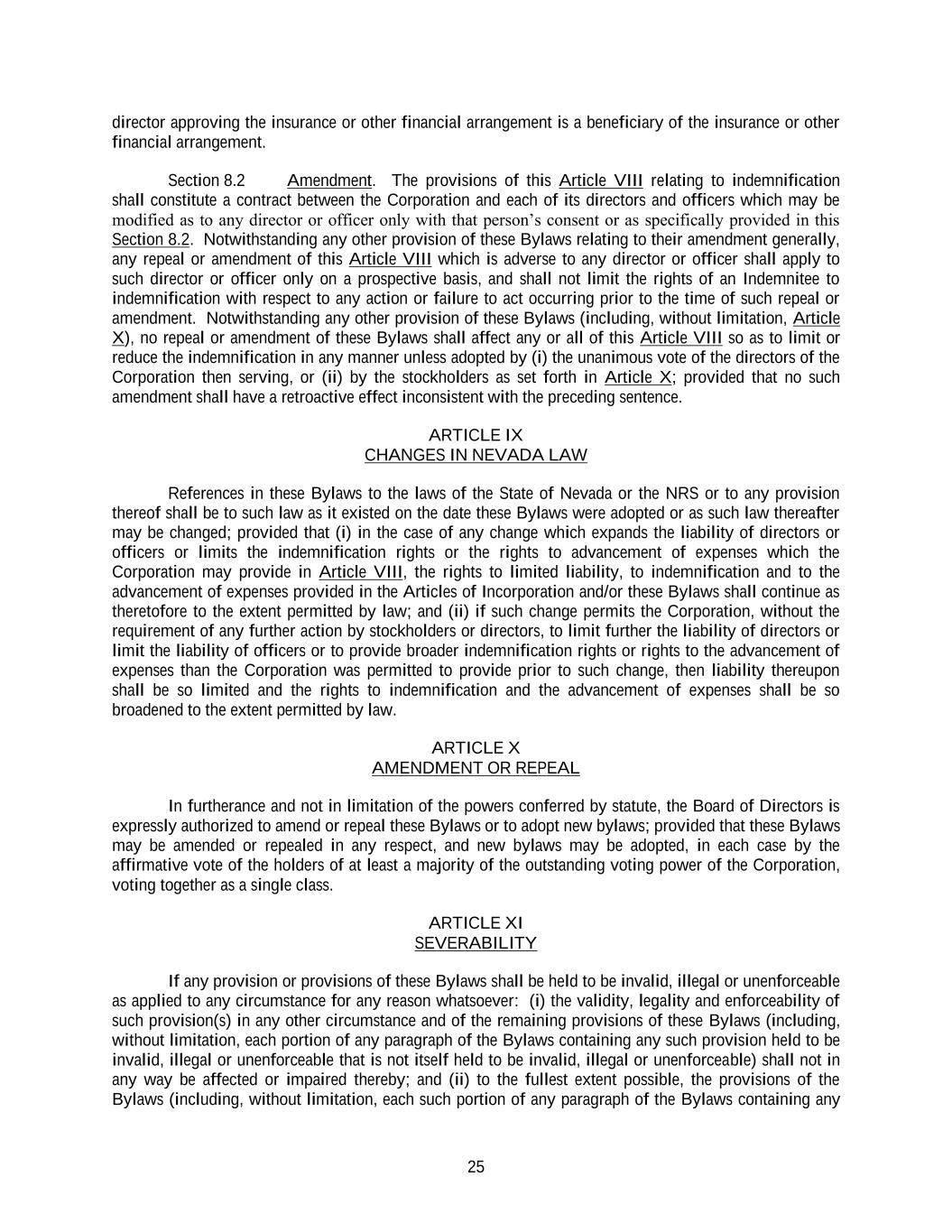 25 director approving the insurance or other financial arrangement is a beneficiary of the insurance or other financial arrangement. Section 8.2 Amendment. The provisions of this Article VIII relating to indemnification shall constitute a contract between the Corporation and each of its directors and officers which may be modified as to any director or officer only with that person’s consent or as specifically provided in this Section 8.2. Notwithstanding any other provision of these Bylaws relating to their amendment generally, any repeal or amendment of this Article VIII which is adverse to any director or officer shall apply to such director or officer only on a prospective basis, and shall not limit the rights of an Indemnitee to indemnification with respect to any action or failure to act occurring prior to the time of such repeal or amendment. Notwithstanding any other provision of these Bylaws (including, without limitation, Article X), no repeal or amendment of these Bylaws shall affect any or all of this Article VIII so as to limit or reduce the indemnification in any manner unless adopted by (i) the unanimous vote of the directors of the Corporation then serving, or (ii) by the stockholders as set forth in Article X; provided that no such amendment shall have a retroactive effect inconsistent with the preceding sentence. ARTICLE IX CHANGES IN NEVADA LAW References in these Bylaws to the laws of the State of Nevada or the NRS or to any provision thereof shall be to such law as it existed on the date these Bylaws were adopted or as such law thereafter may be changed; provided that (i) in the case of any change which expands the liability of directors or officers or limits the indemnification rights or the rights to advancement of expenses which the Corporation may provide in Article VIII, the rights to limited liability, to indemnification and to the advancement of expenses provided in the Articles of Incorporation and/or these Bylaws shall continue as theretofore to the extent permitted by law; and (ii) if such change permits the Corporation, without the requirement of any further action by stockholders or directors, to limit further the liability of directors or limit the liability of officers or to provide broader indemnification rights or rights to the advancement of expenses than the Corporation was permitted to provide prior to such change, then liability thereupon shall be so limited and the rights to indemnification and the advancement of expenses shall be so broadened to the extent permitted by law. ARTICLE X AMENDMENT OR REPEAL In furtherance and not in limitation of the powers conferred by statute, the Board of Directors is expressly authorized to amend or repeal these Bylaws or to adopt new bylaws; provided that these Bylaws may be amended or repealed in any respect, and new bylaws may be adopted, in each case by the affirmative vote of the holders of at least a majority of the outstanding voting power of the Corporation, voting together as a single class. ARTICLE XI SEVERABILITY If any provision or provisions of these Bylaws shall be held to be invalid, illegal or unenforceable as applied to any circumstance for any reason whatsoever: (i) the validity, legality and enforceability of such provision(s) in any other circumstance and of the remaining provisions of these Bylaws (including, without limitation, each portion of any paragraph of the Bylaws containing any such provision held to be invalid, illegal or unenforceable that is not itself held to be invalid, illegal or unenforceable) shall not in any way be affected or impaired thereby; and (ii) to the fullest extent possible, the provisions of the Bylaws (including, without limitation, each such portion of any paragraph of the Bylaws containing any
